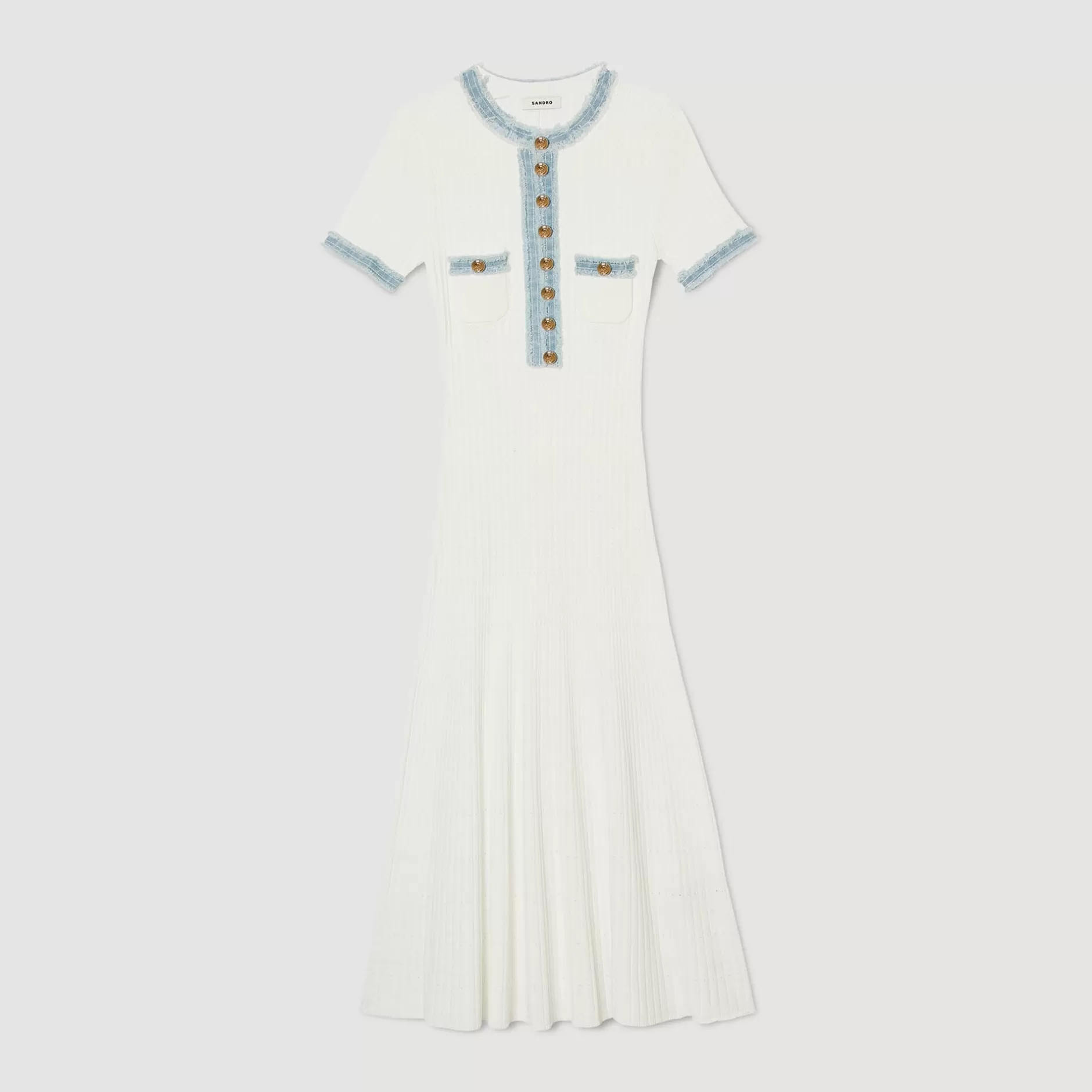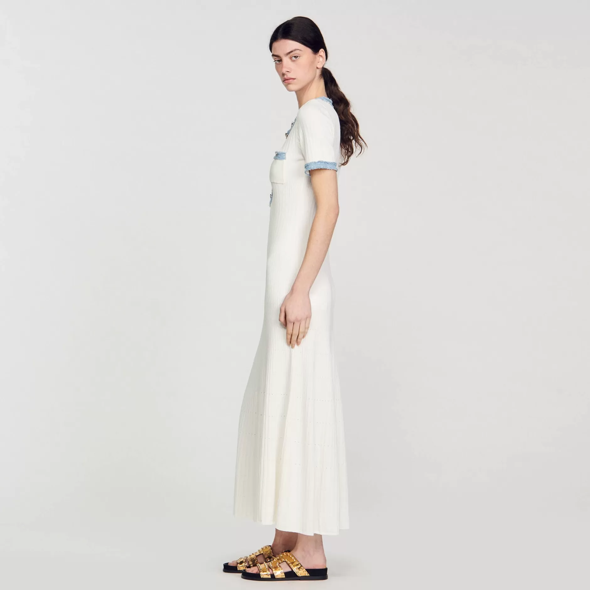 Robe midi en maille fantaisie ornée d’empiècements en denim effiloché, munie d’un col rond boutonné, de manches courtes, et de deux poches plaquées à la poitrine.