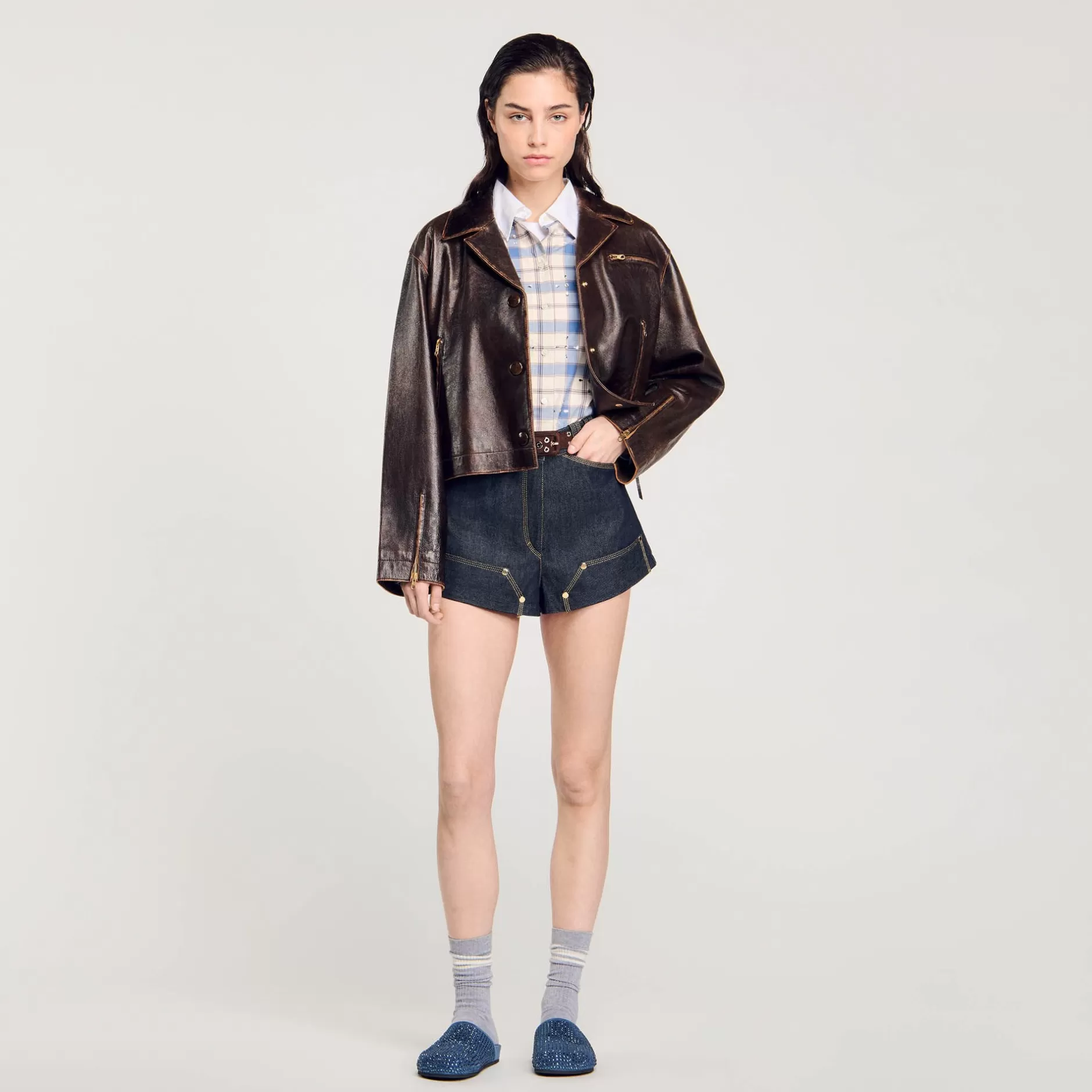Short en denim brut esprit worker à surpiqures contrastées, muni d’une sangle sur le côté et de poches plaquées.