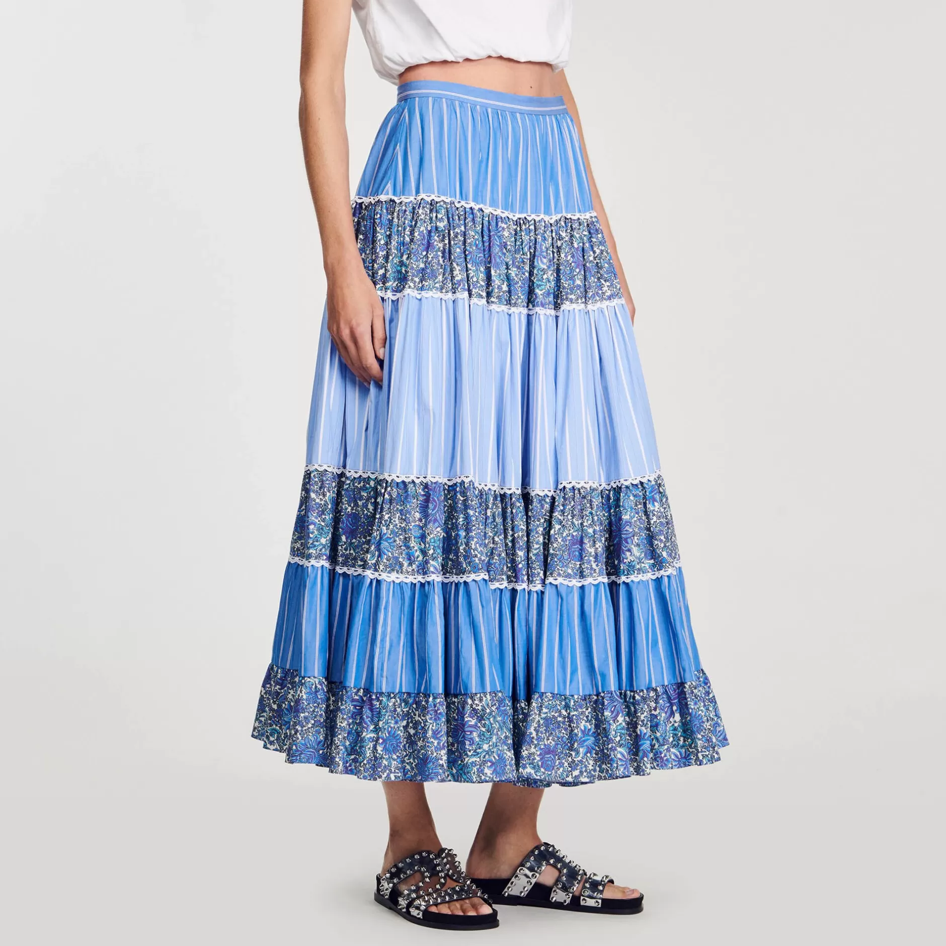 Jupe longue et volumineuse ornée de volants en patchworks à imprimés différents et de galons contrastés.
