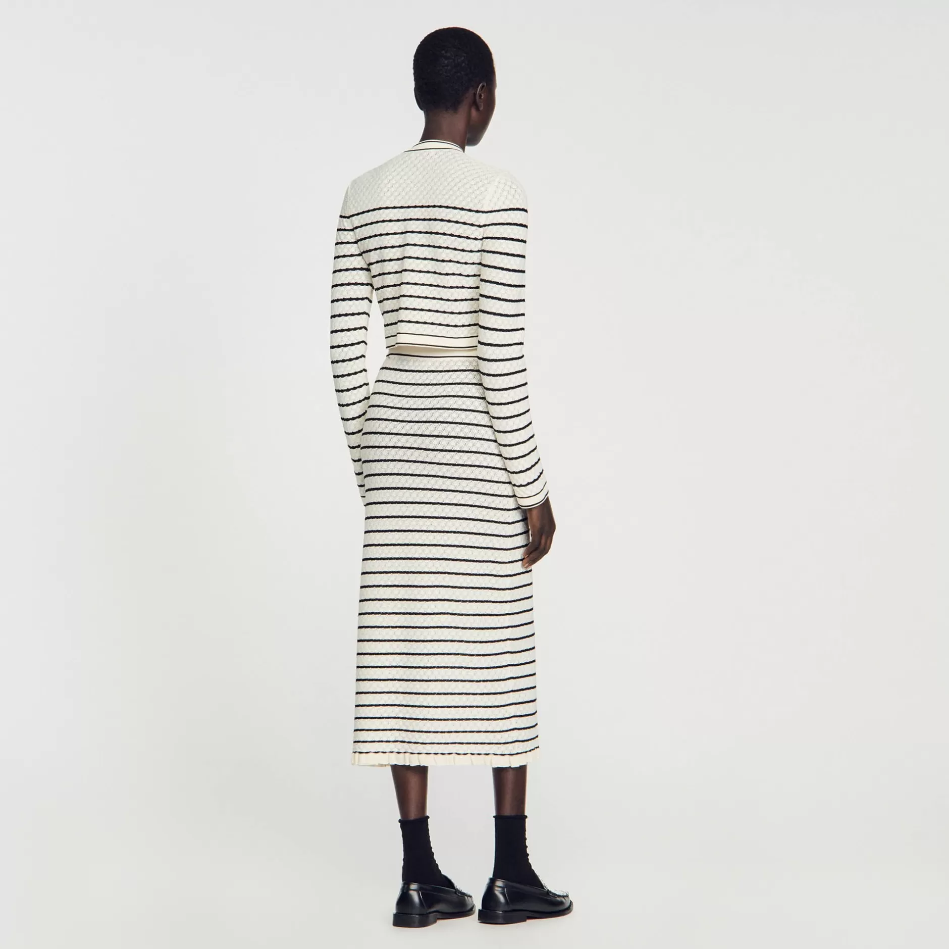 Jupe midi en maille à rayures et points fantaisies ornée d’un volant sur le bas, et munie de poches plaquées à la taille.