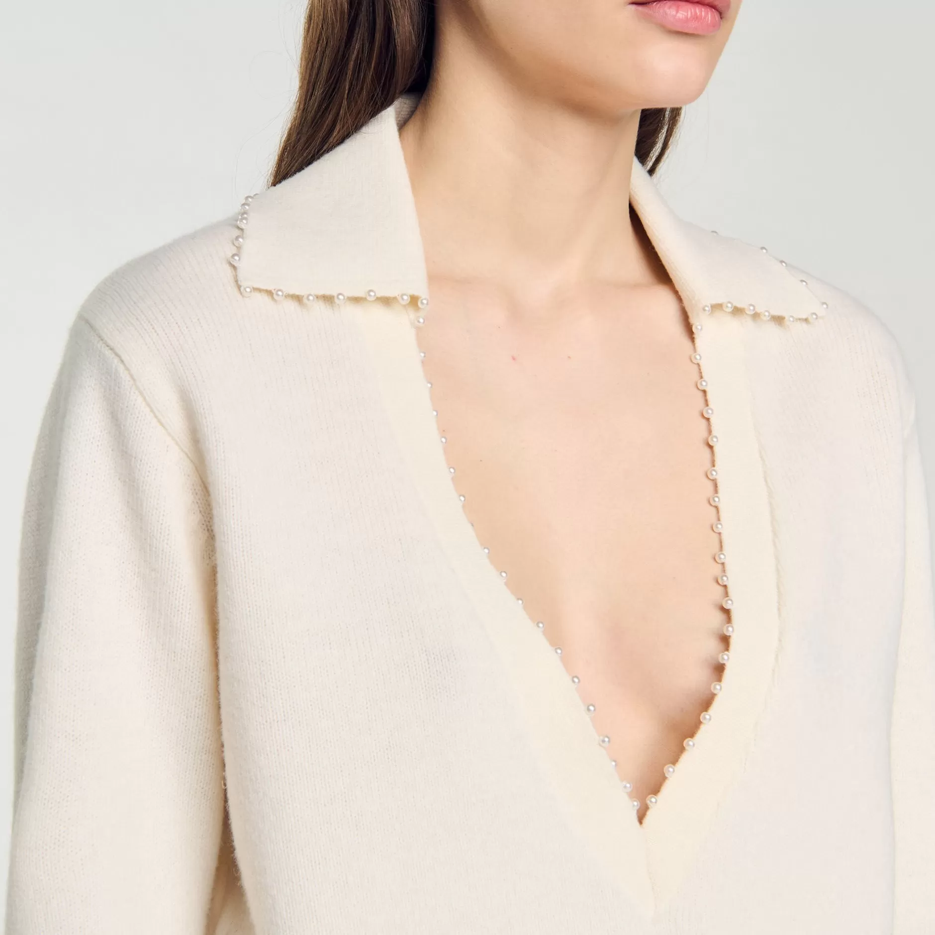 Pull en maille côtelée muni d’un col polo ouvert en V orné de petites perles, et de manches longues.
