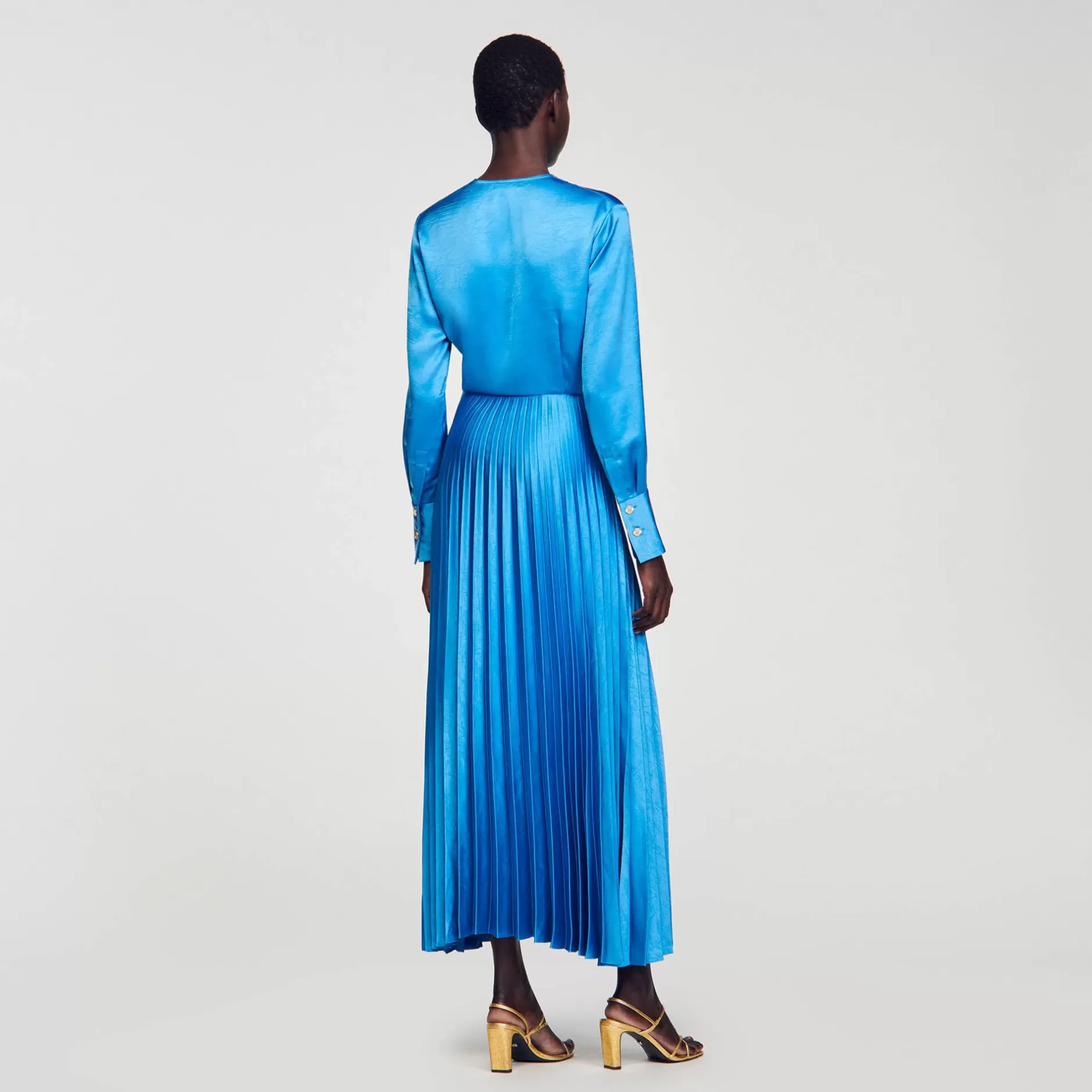 Robe midi fluide satinée, munie d’une encolure en V croisée, de manches longues à poignets resserrés ornés de boutons fantaisie, et d’une jupe plissée évasée.