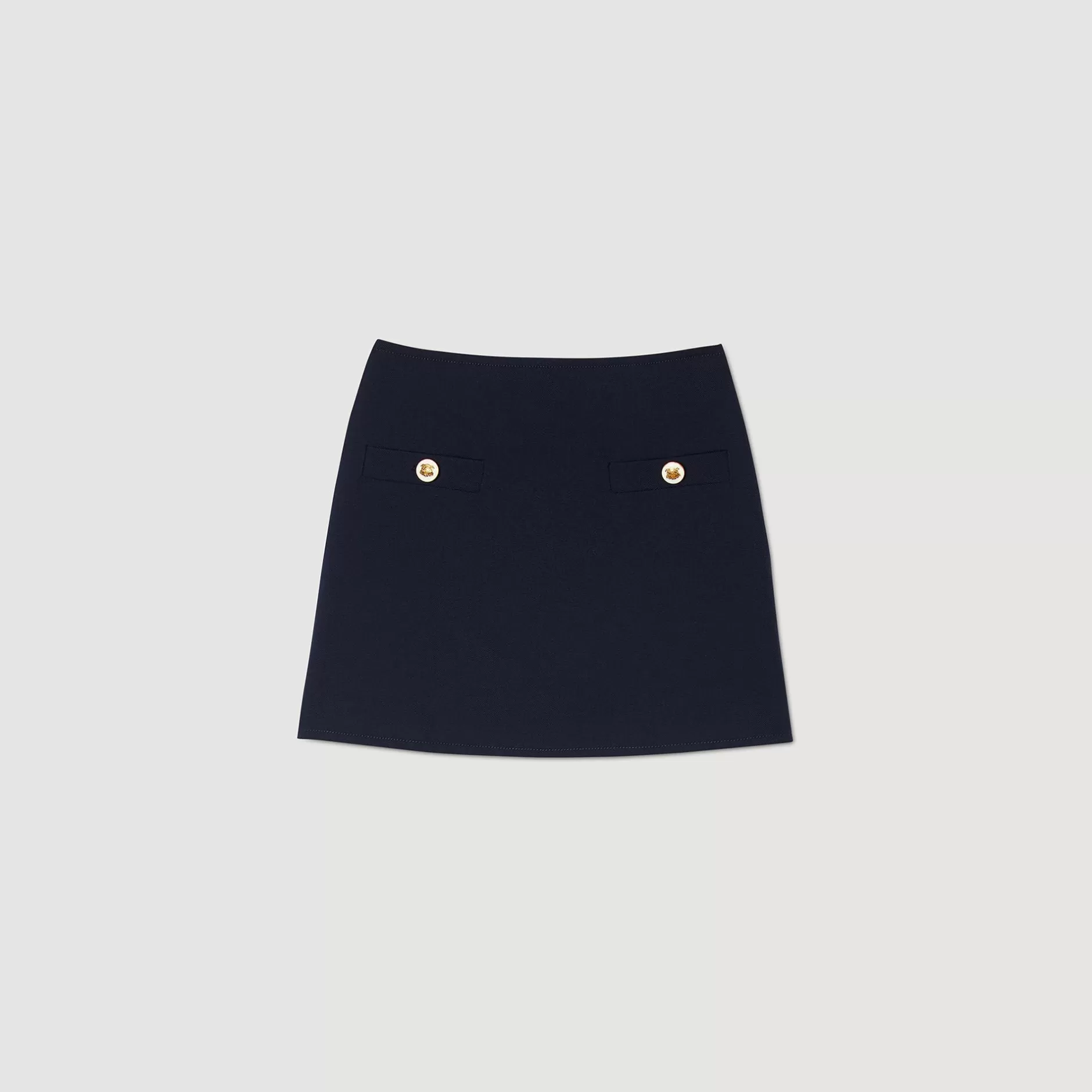 Jupe courte en twill de laine mélangé, munie de petites fentes côtés, et de fausses poches passepoilées devant ornées de boutons fantaisies.