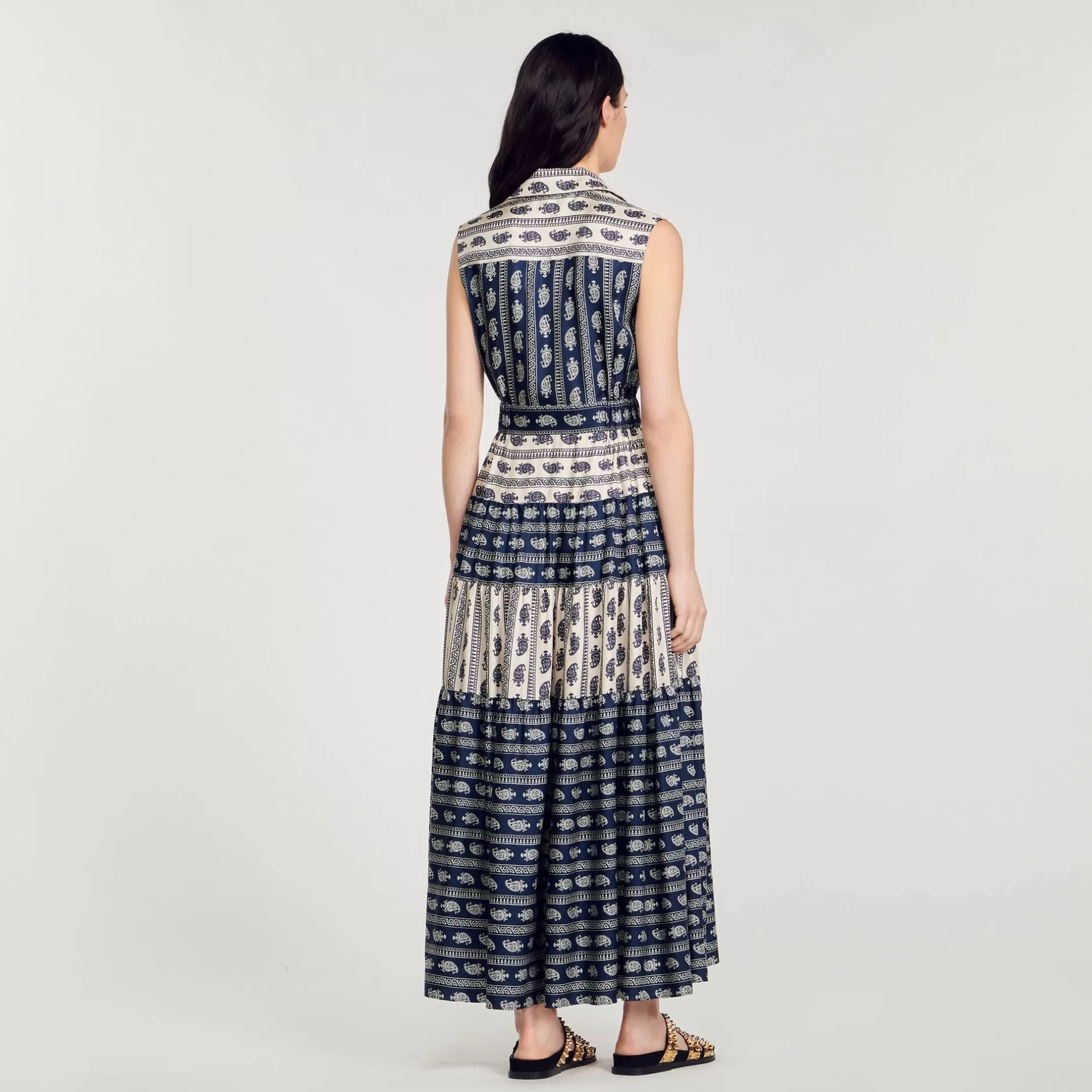 Robe longue sans manches munie d’une partie top esprit chemise boutonnée ajourée à nouer devant, d’une jupe évasée, et ornée d’un imprimé Paisley.