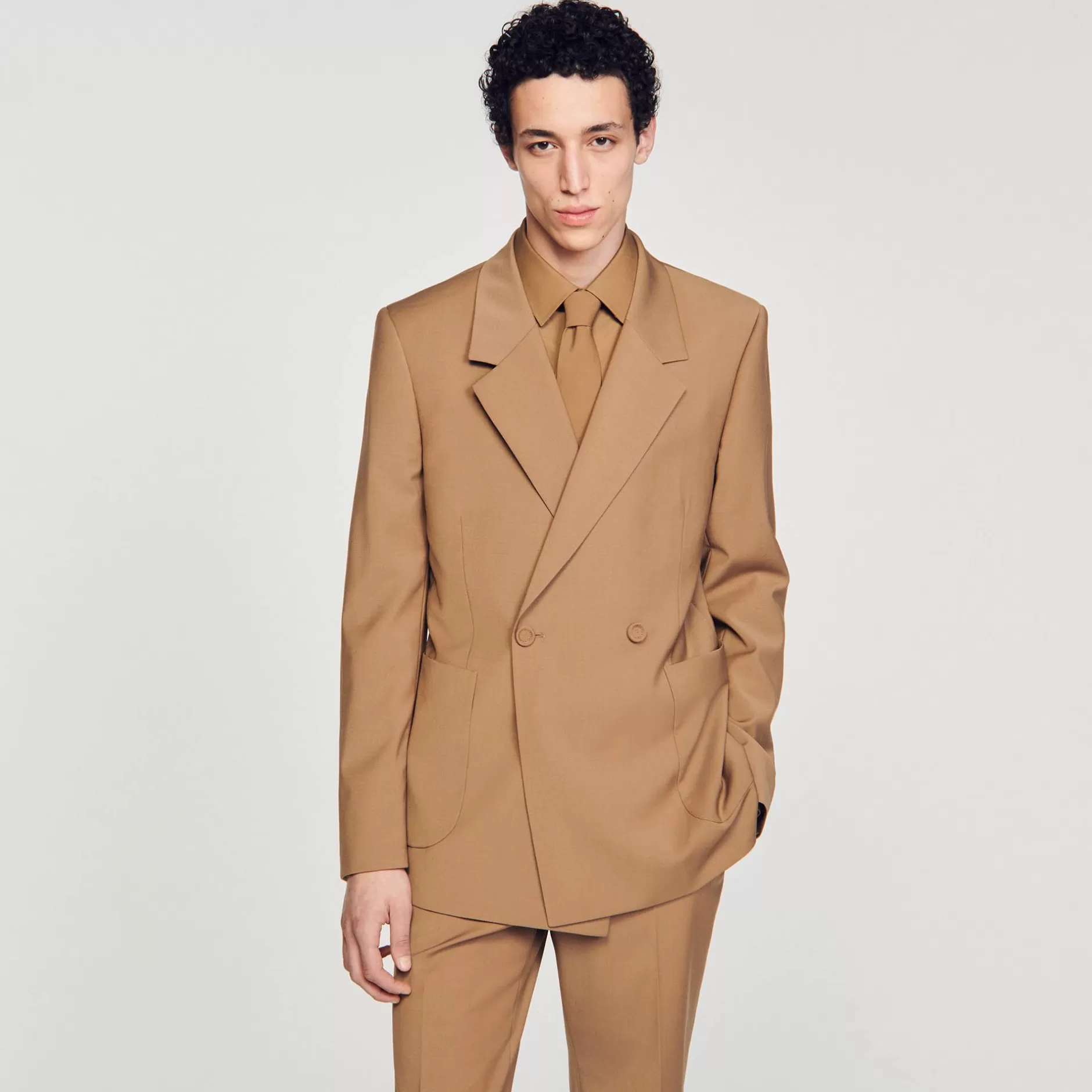 Veste de costume en laine mélangée à boutonnage croisé, munie de manches longues à poignets boutonnés, d’un col à revers et de poches plaquées à l’avant.