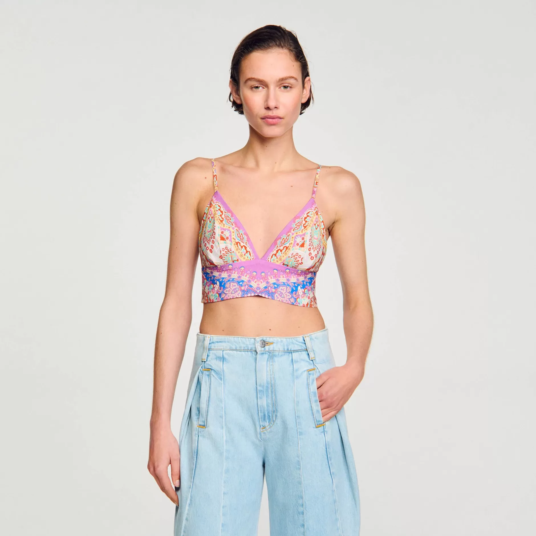 Top esprit brassière à encolure en V et fines bretelles, muni d’une large bande sous poitrine et orné d’un imprimé fleuri.