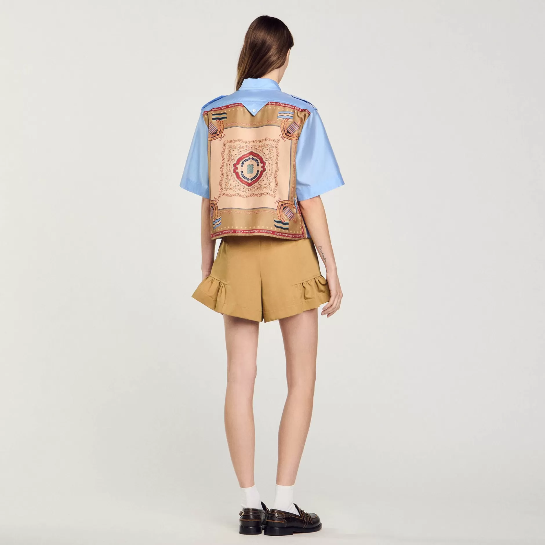 Chemise à manches courtes en tissu technique satiné devant et imprimé foulard au dos, munie de manches courtes, de poches plaquées à la poitrine, et d’un empiècement triangle boutonné au dos.