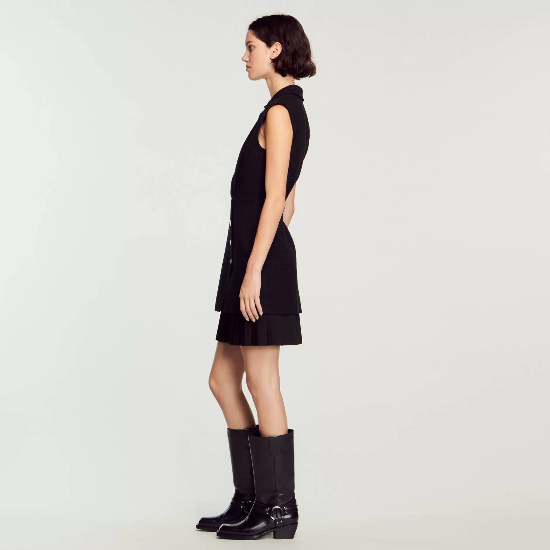 Robe droite en tweed à effet portefeuille, sans manches, munie d’une encolure façon veste, et d’une jupe plissée en superposition, ornée de boutons pression.