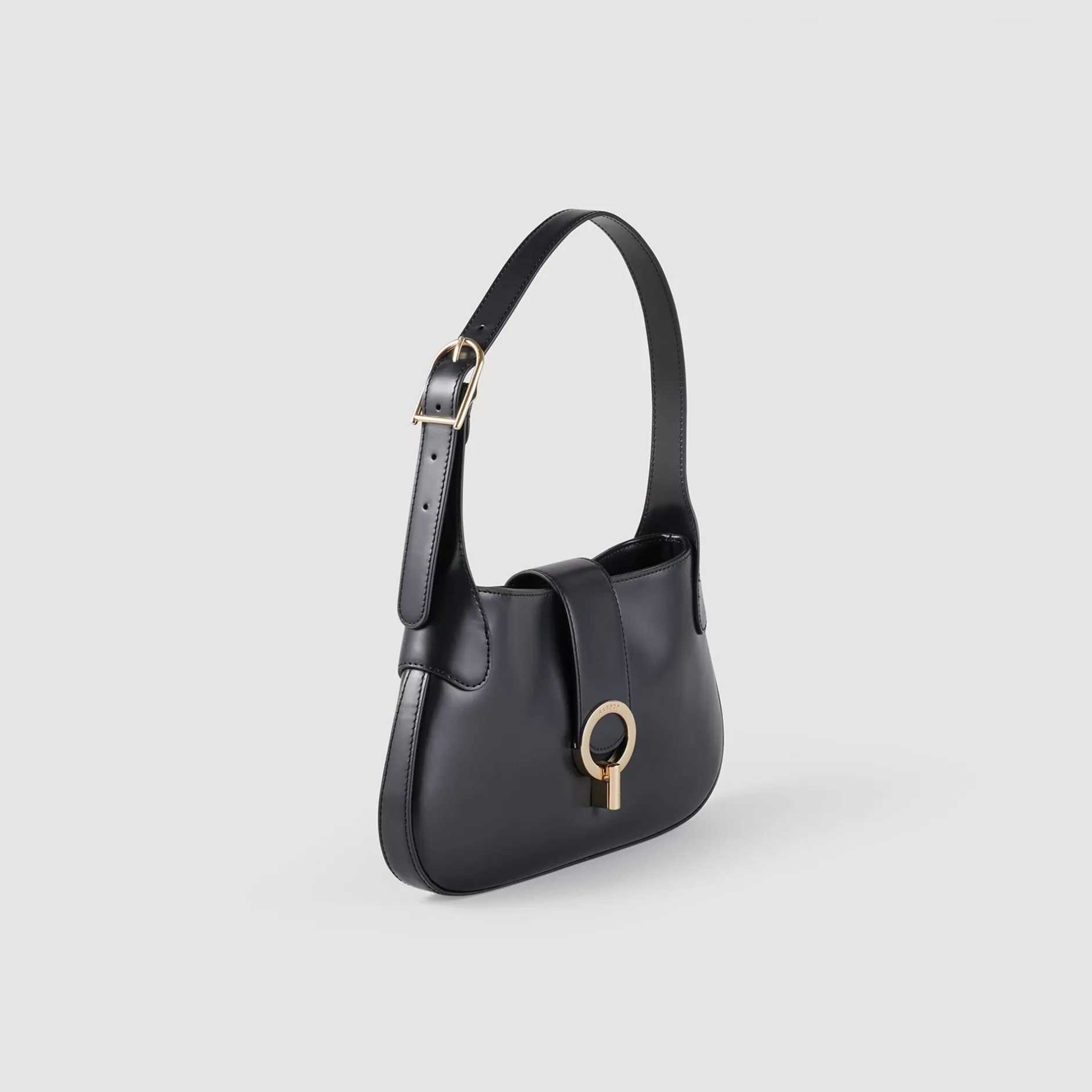 Sac porté épaule en cuir lisse, muni d’un fermoir signature et d’une anse à boucle métallique.
