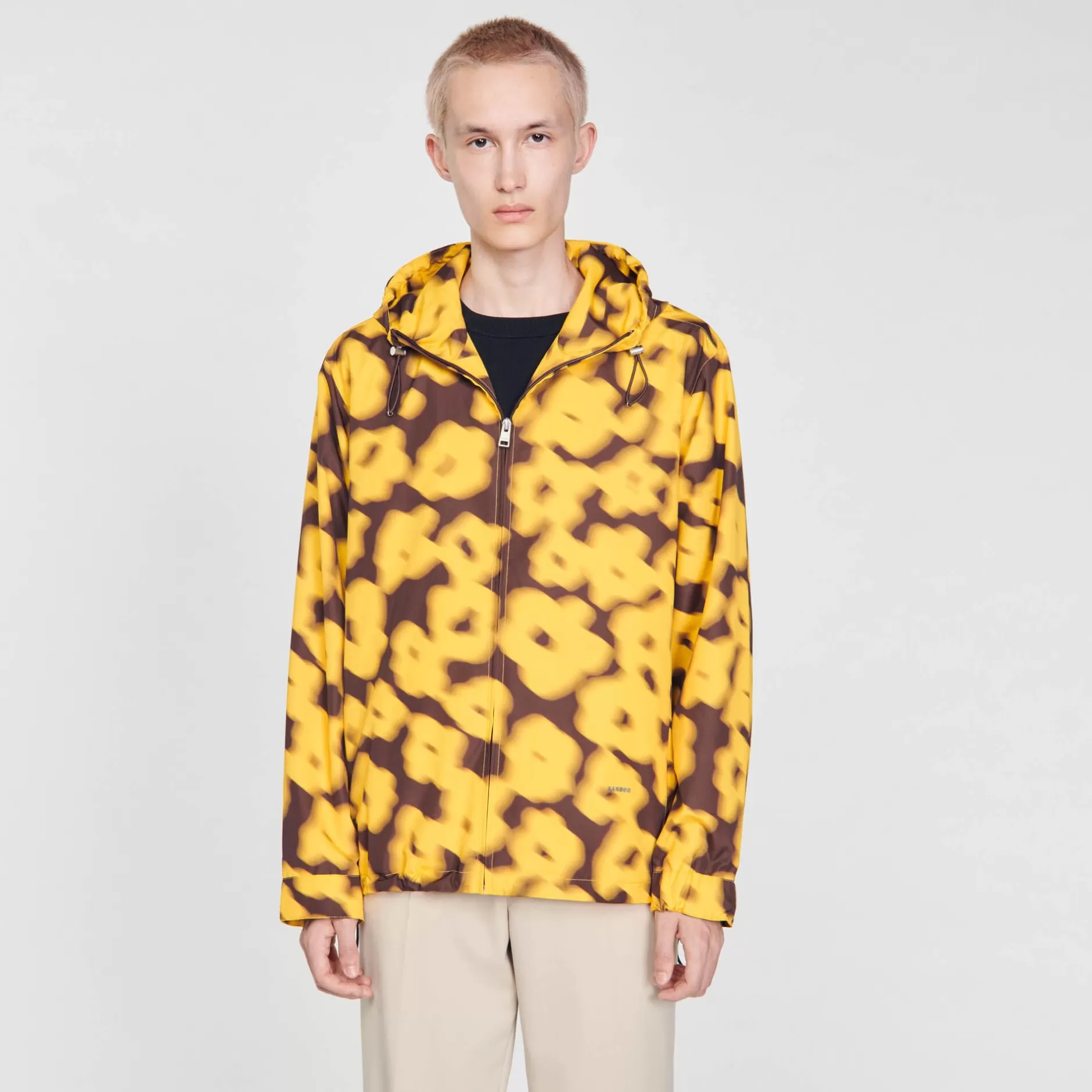 Blouson technique à capuche et manches longues muni d’une fermeture zippée, de poches sur les cotés et de liens de serrages, et orné d’un imprimé fleuri effet flou.