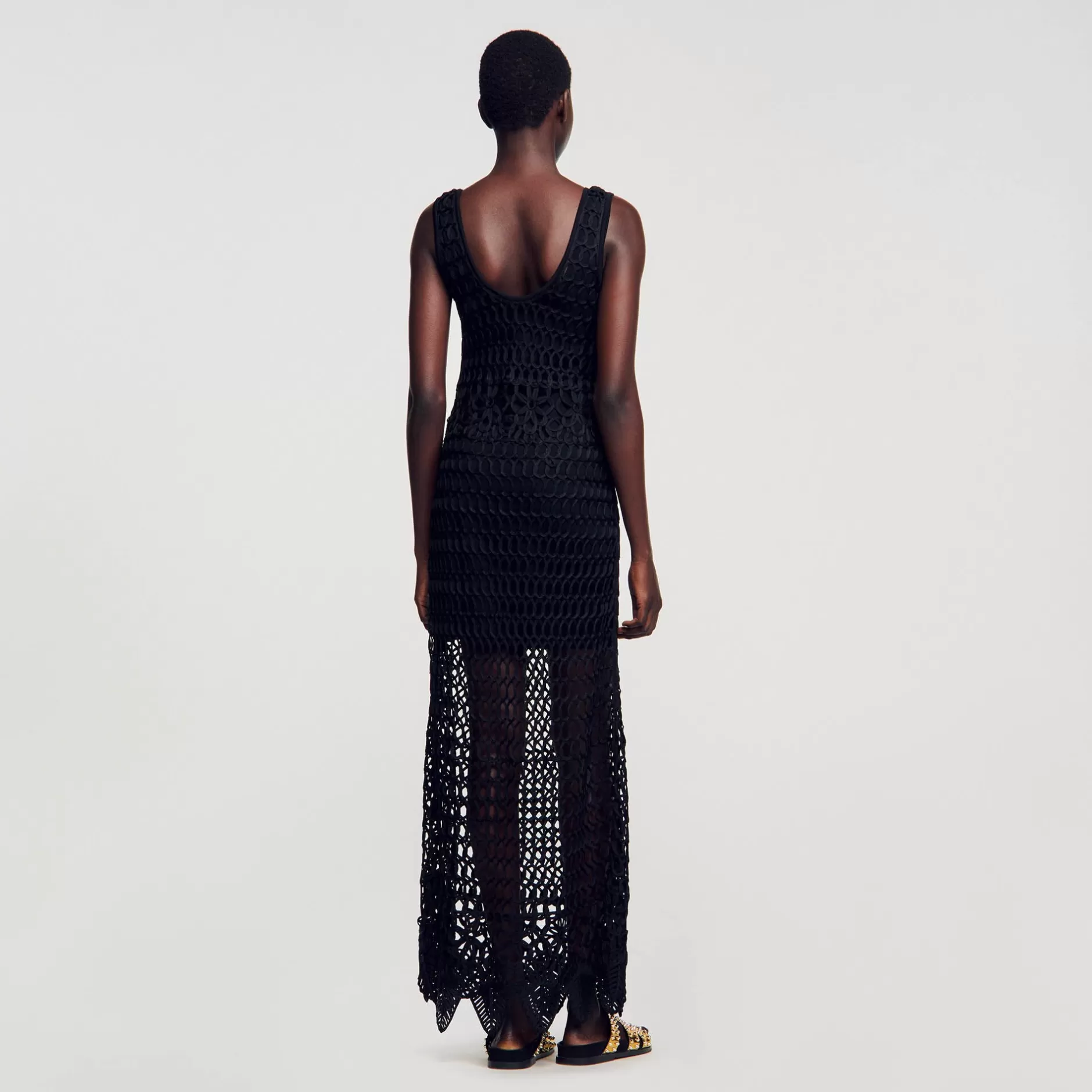 Robe longue en maille esprit crochet sans manches, munie d’une encolure arrondie, et d’un bas festonné.
