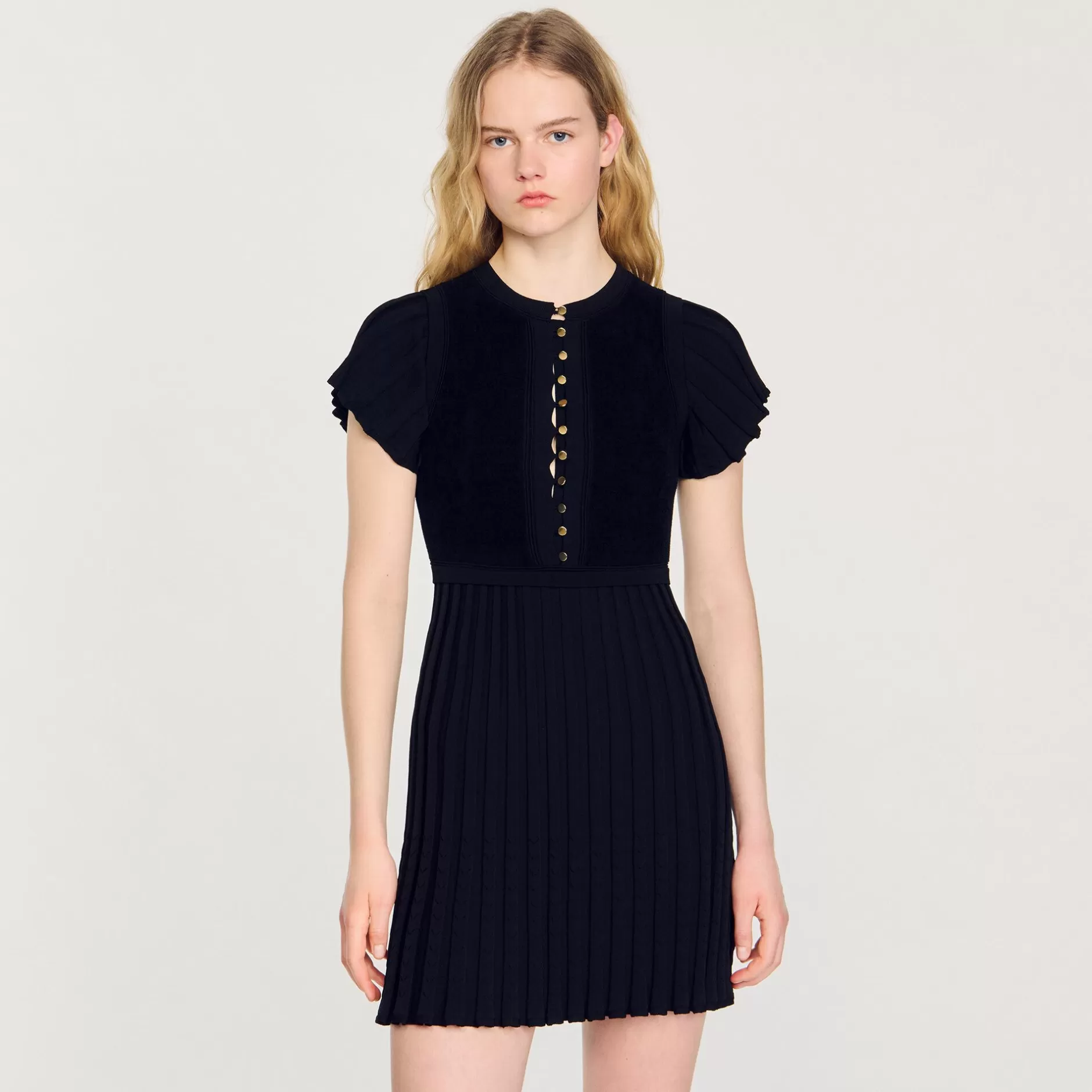 Robe courte en maille effet velours munie d’un col rond boutonné, de manches courtes et d’une jupe plissée volantées.