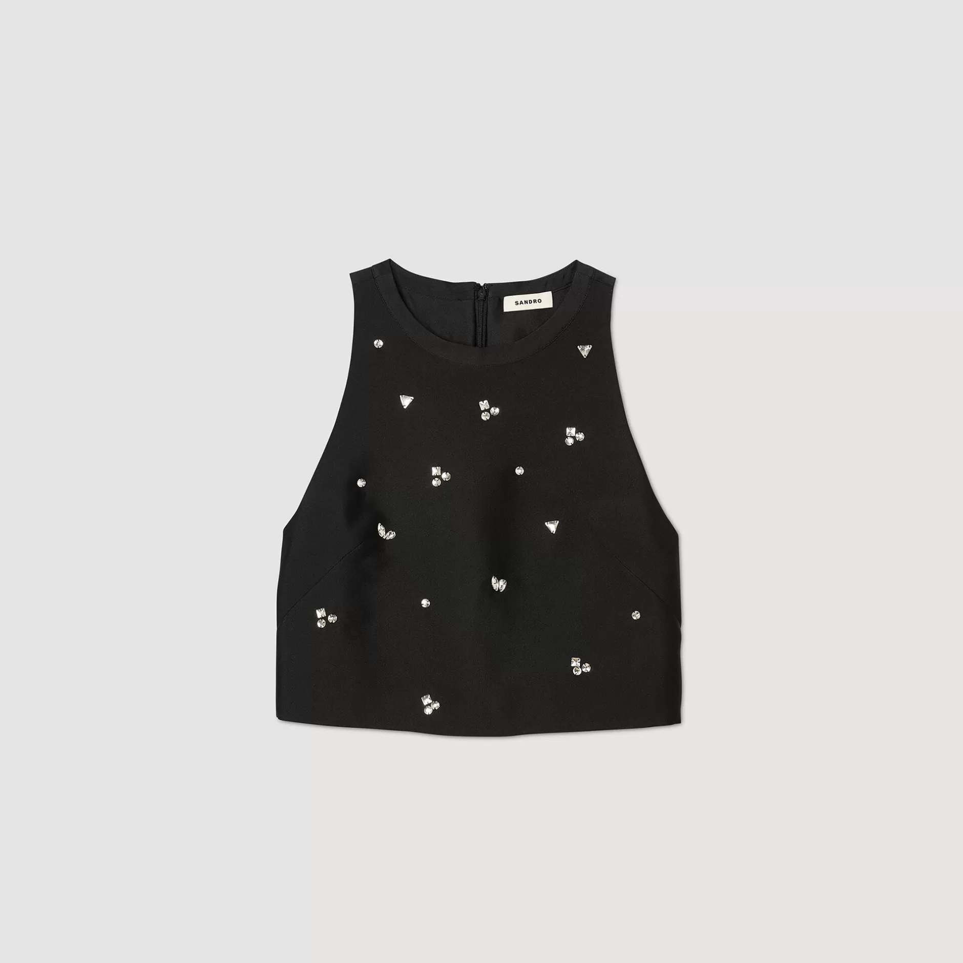 Top court sans manches à col rond en soie mélangée orné de strass all over.Top court Sandro Femme Strass all over Co…