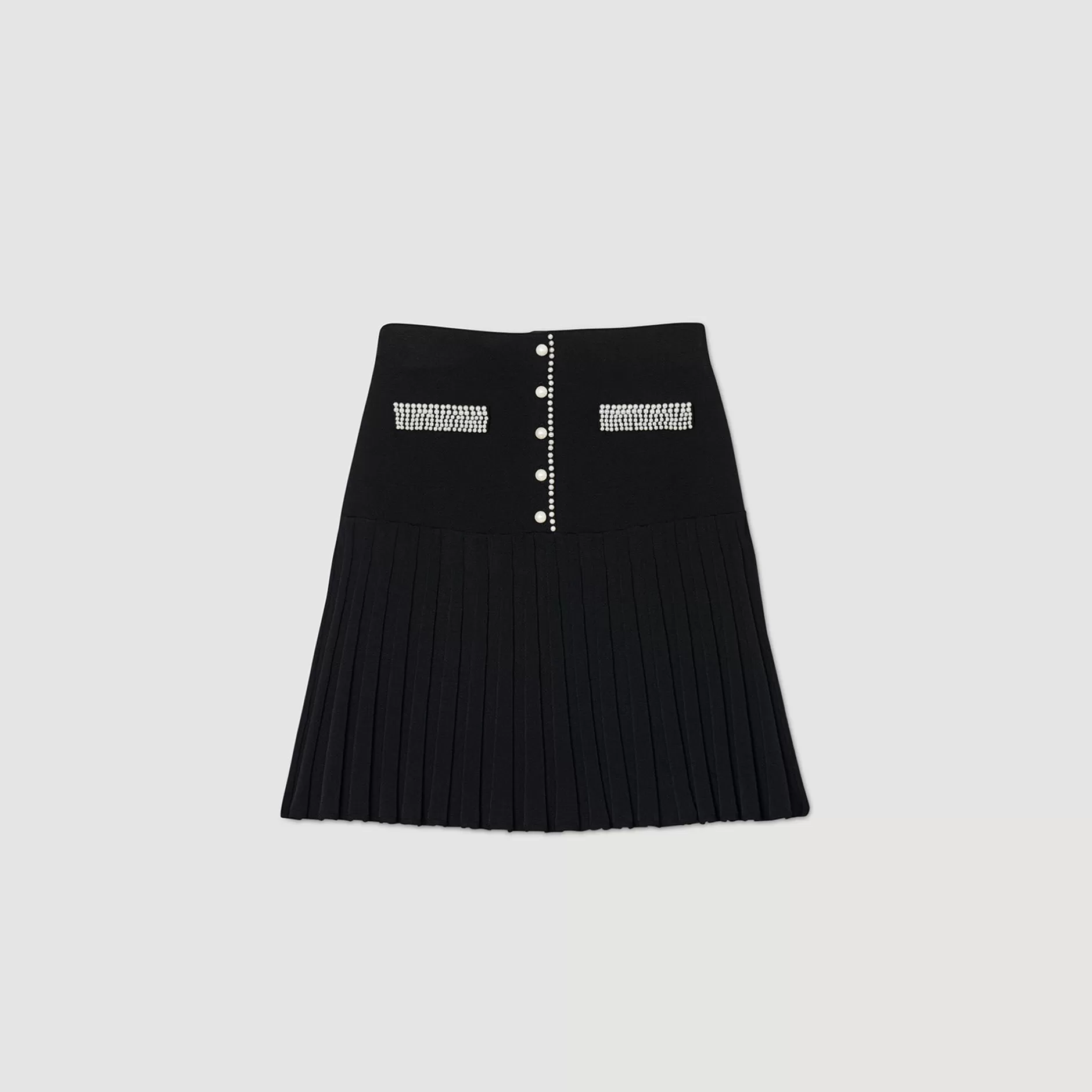 Jupe courte en maille à faux boutons perlés sur le haut et plissée sur le bas, ornée de petites perles sur les poches.