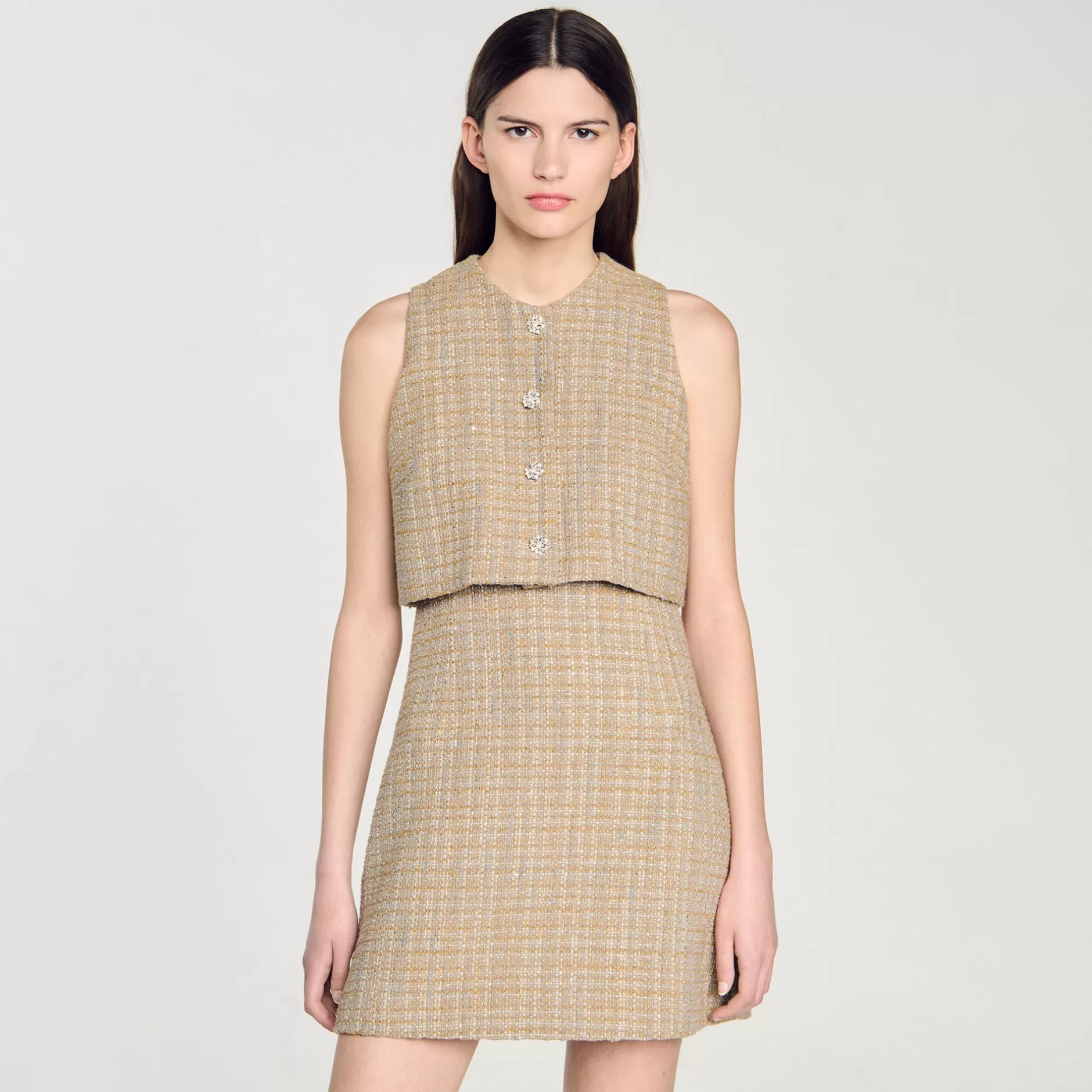 Robe trompe-l’œil sans manches en tweed 2 en 1, munie d’un col rond, d’un haut effet top orné de boutons bijoux, et d’une jupe courte et droite.