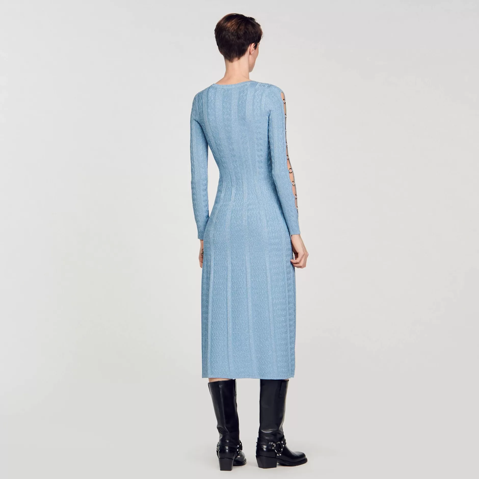 Robe midi en maille câblée irisée munie d’un col rond et de manches longues ornées d’anneaux métalliques le long des bras.