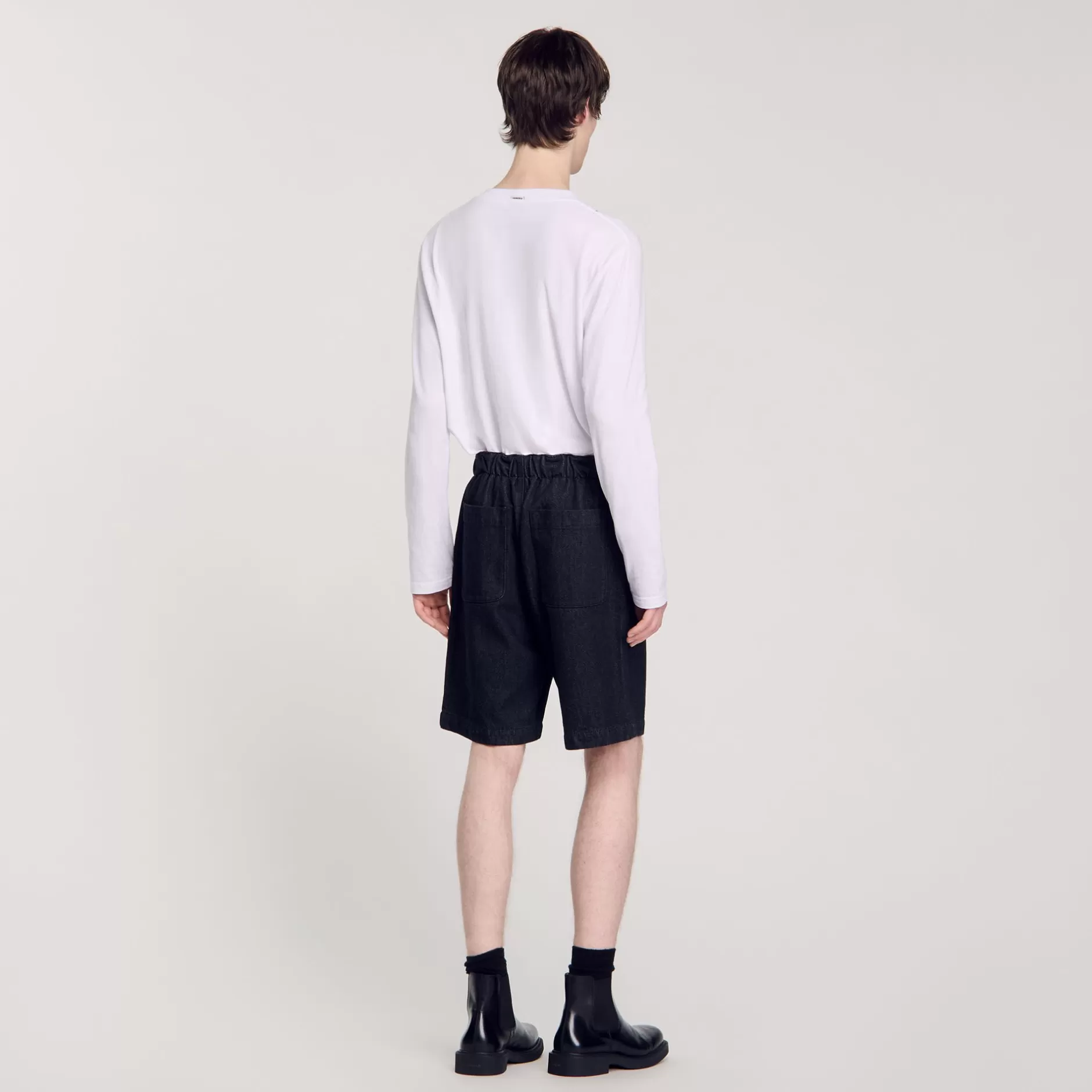 Bermuda en denim brut muni d’une taille élastiquée, d’une fermeture à bouton, de deux larges poches plaquées au dos et orné d’un logo SANDRO en métal.