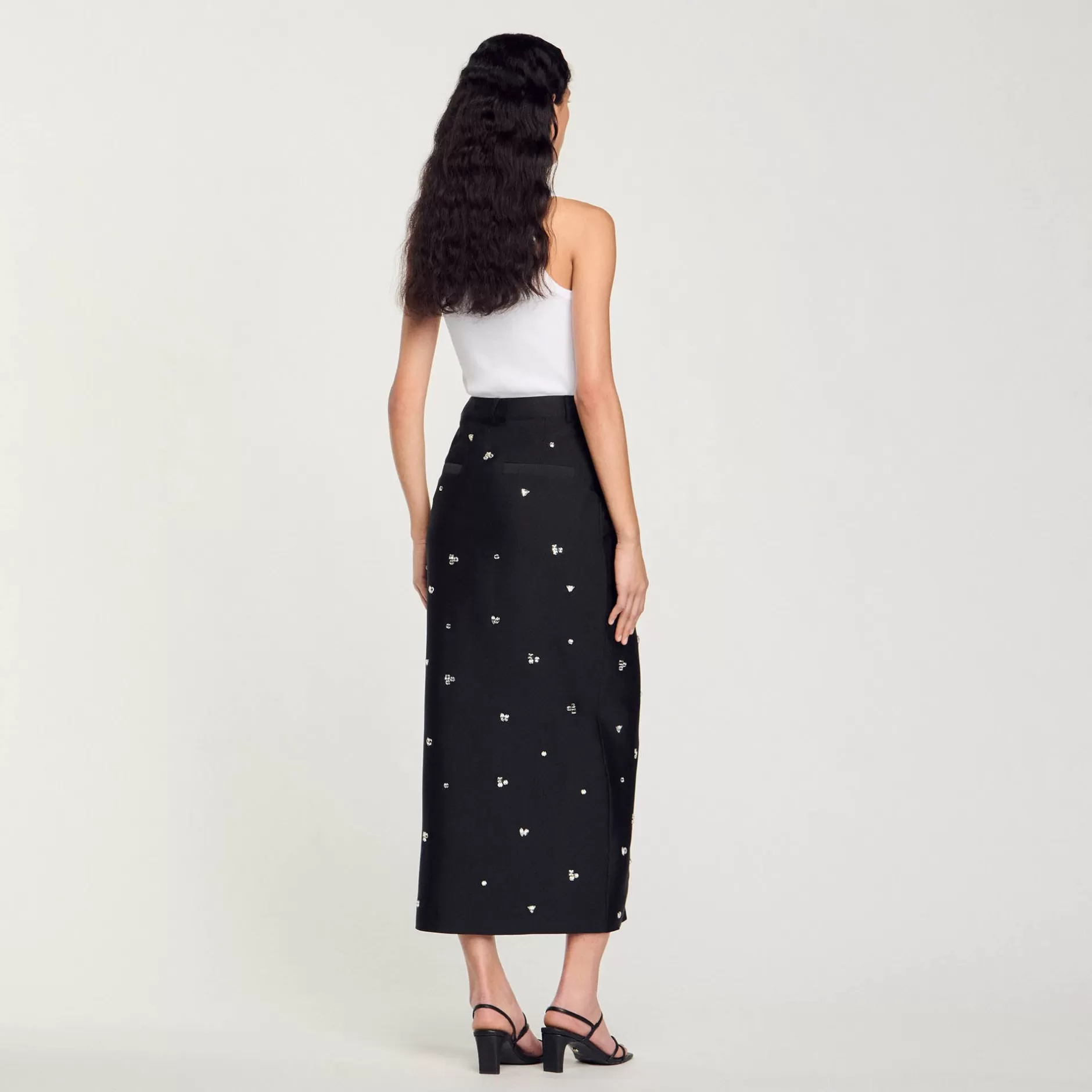 Jupe droite en soie mélangée munie d’une fente avant et ornée de strass al over.Jupe droite strassée Sandro Femme So…