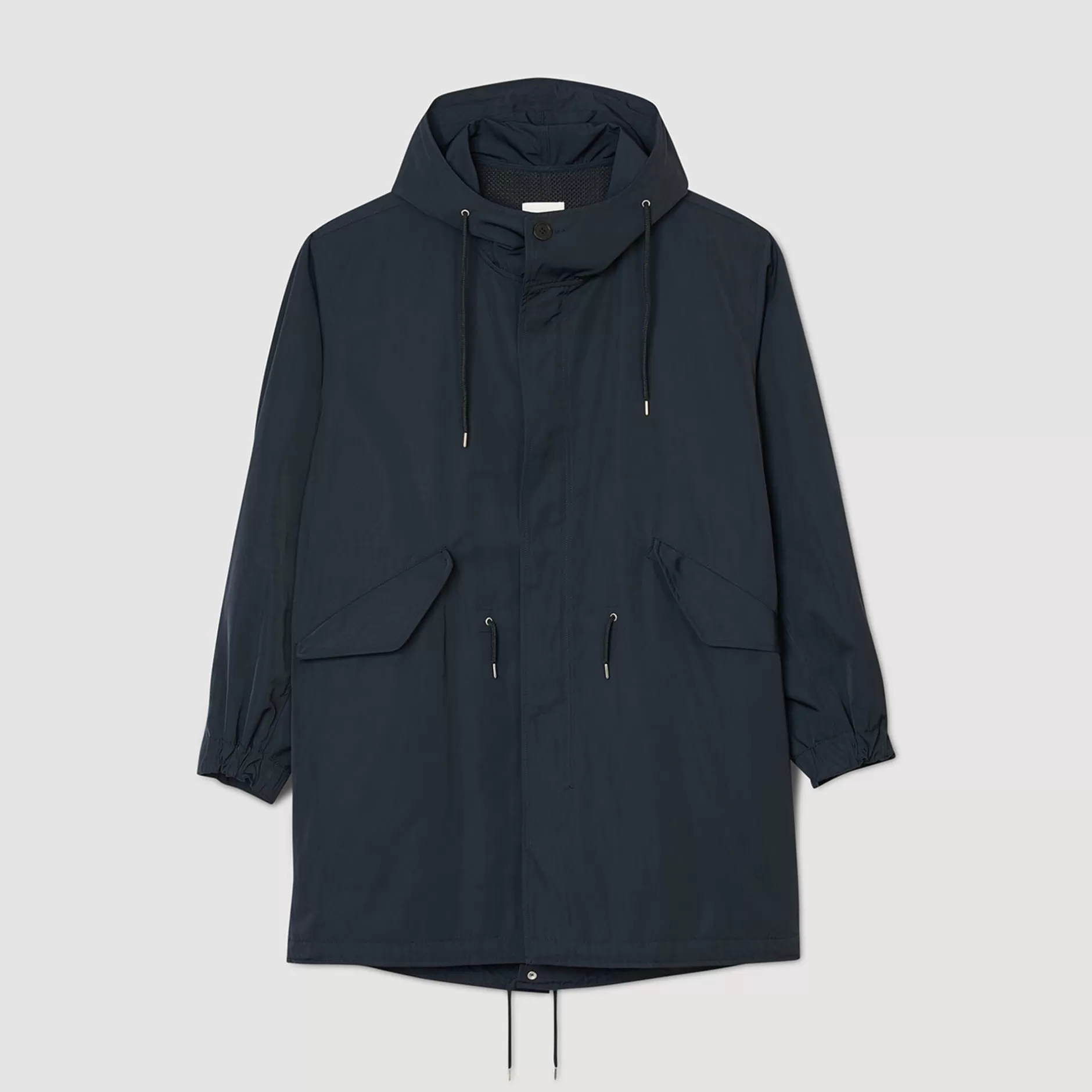 Parka longue et oversize en tissu technique munie d’une capuche, de manches longues, d’une fermeture boutonnée à patte recouverte, de poches à rabats sur les côtés et d’un cordon de resserrage en bas de vêtement.