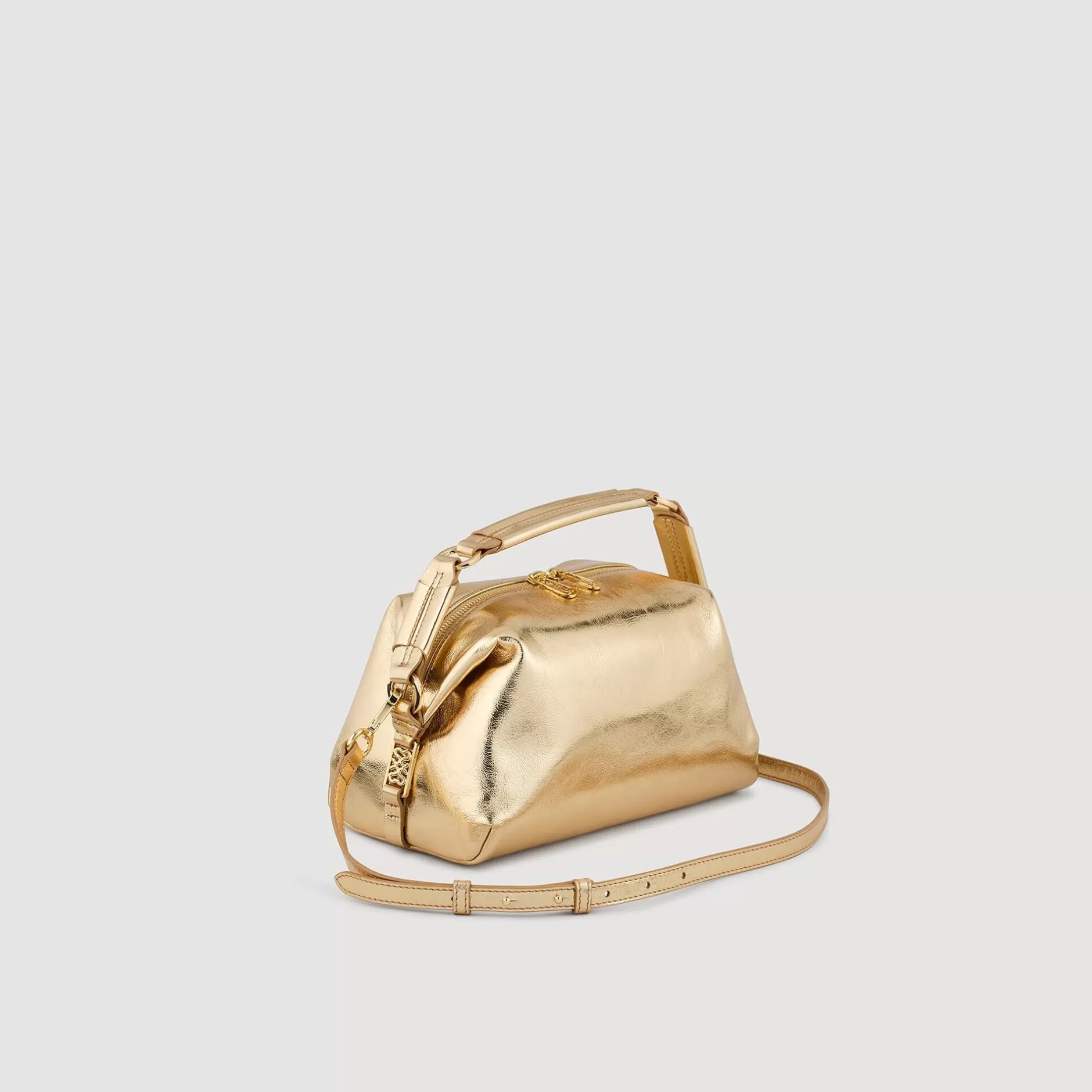 Sac à main Le 84 en cuir lisse doré, muni d’une poignée plate, d’une bandoulière amovible, d’une fermeture zippée et orné de boucles en métal 4S sur les côtés.