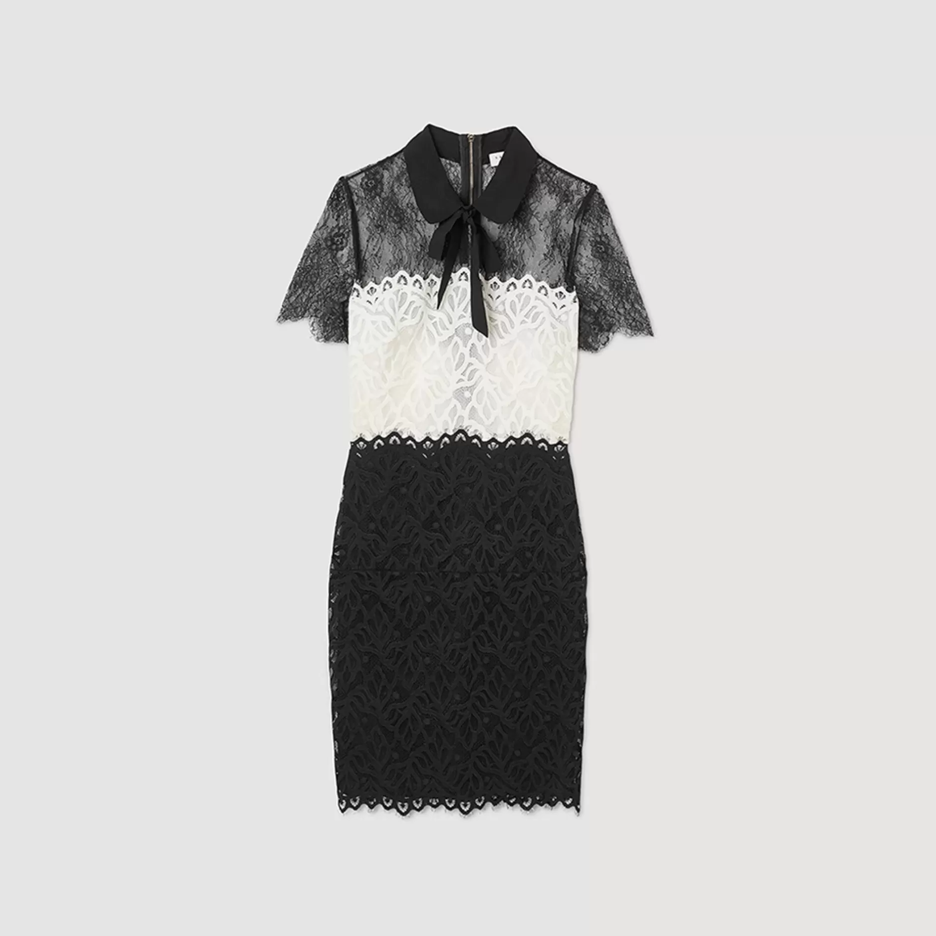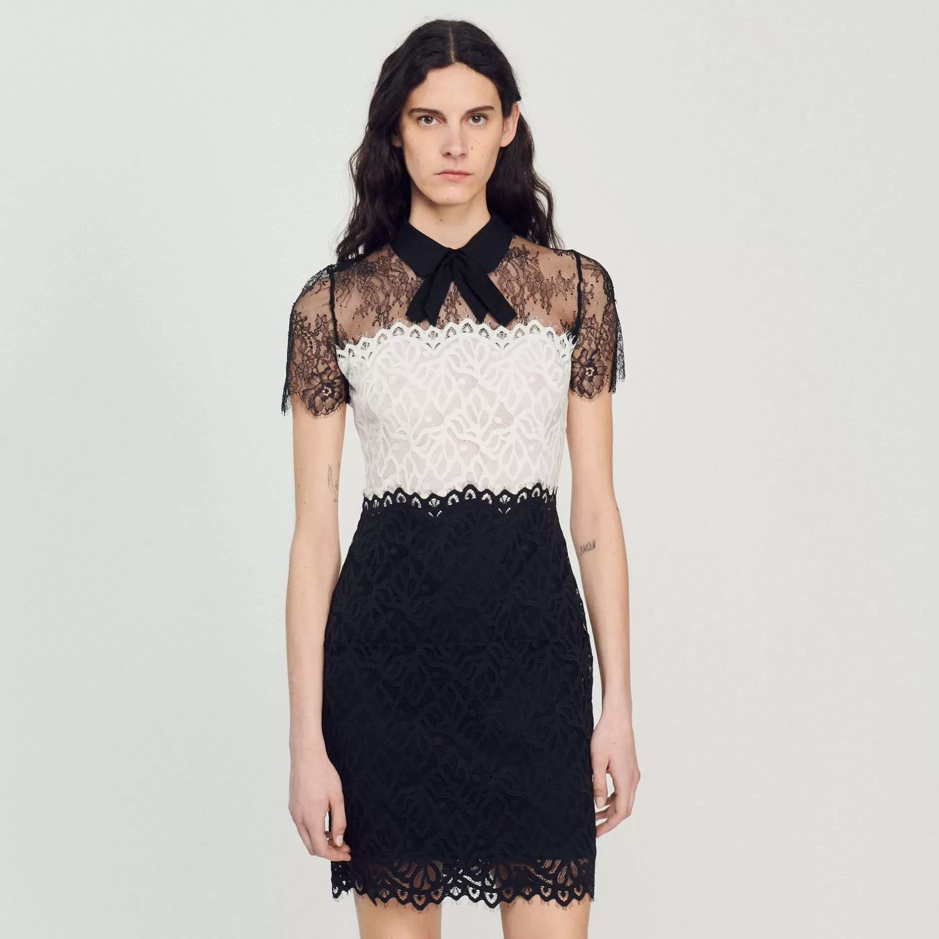 Robe femme Sandro• Col claudine avec lien à nouer et manches courtes• Manches et col en dentelle transparente• Re…