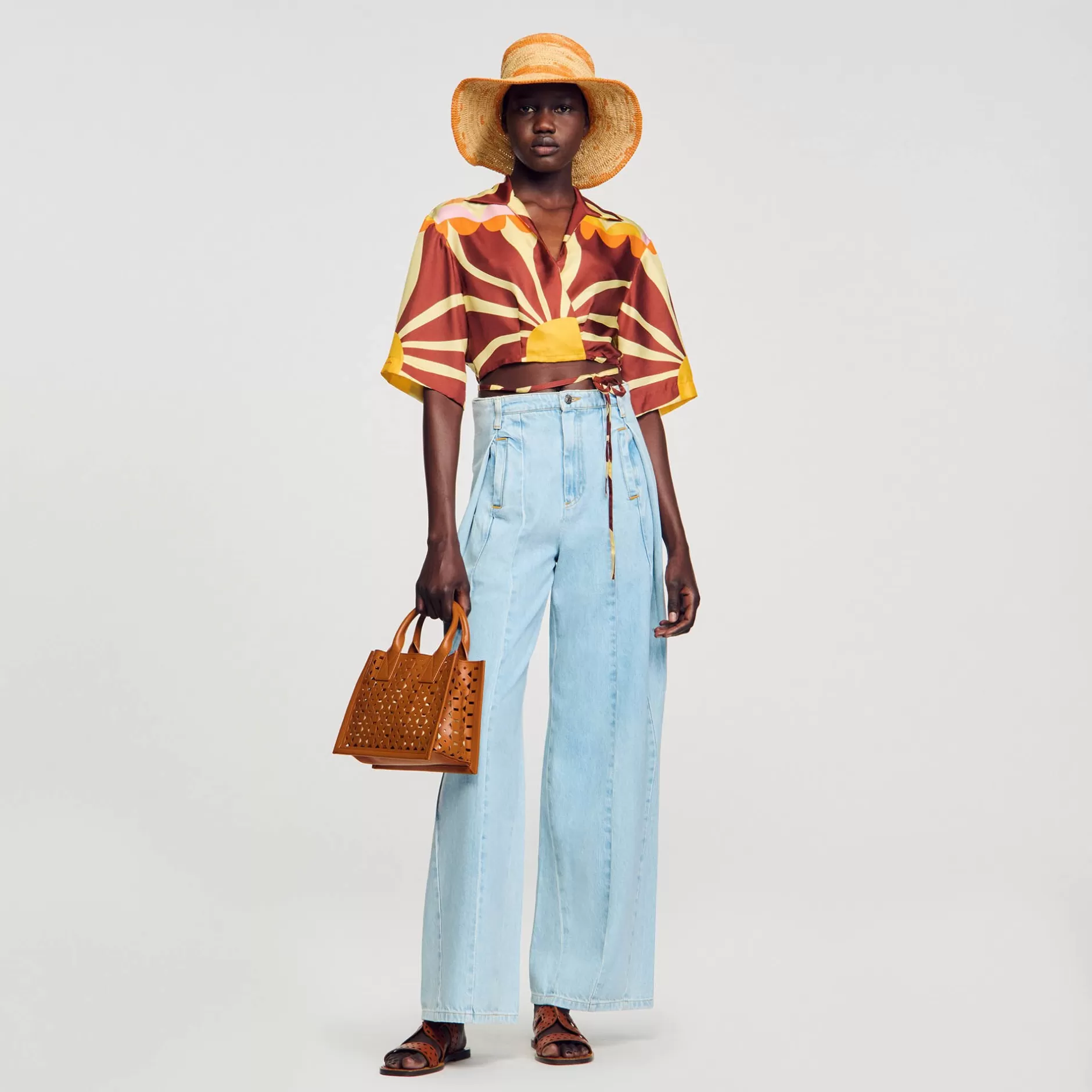 Chemise courte 100% soie effet cache-cœur à nouer, munie d’un col à revers, de manches courtes larges, et ornée d’un imprimé soleil.