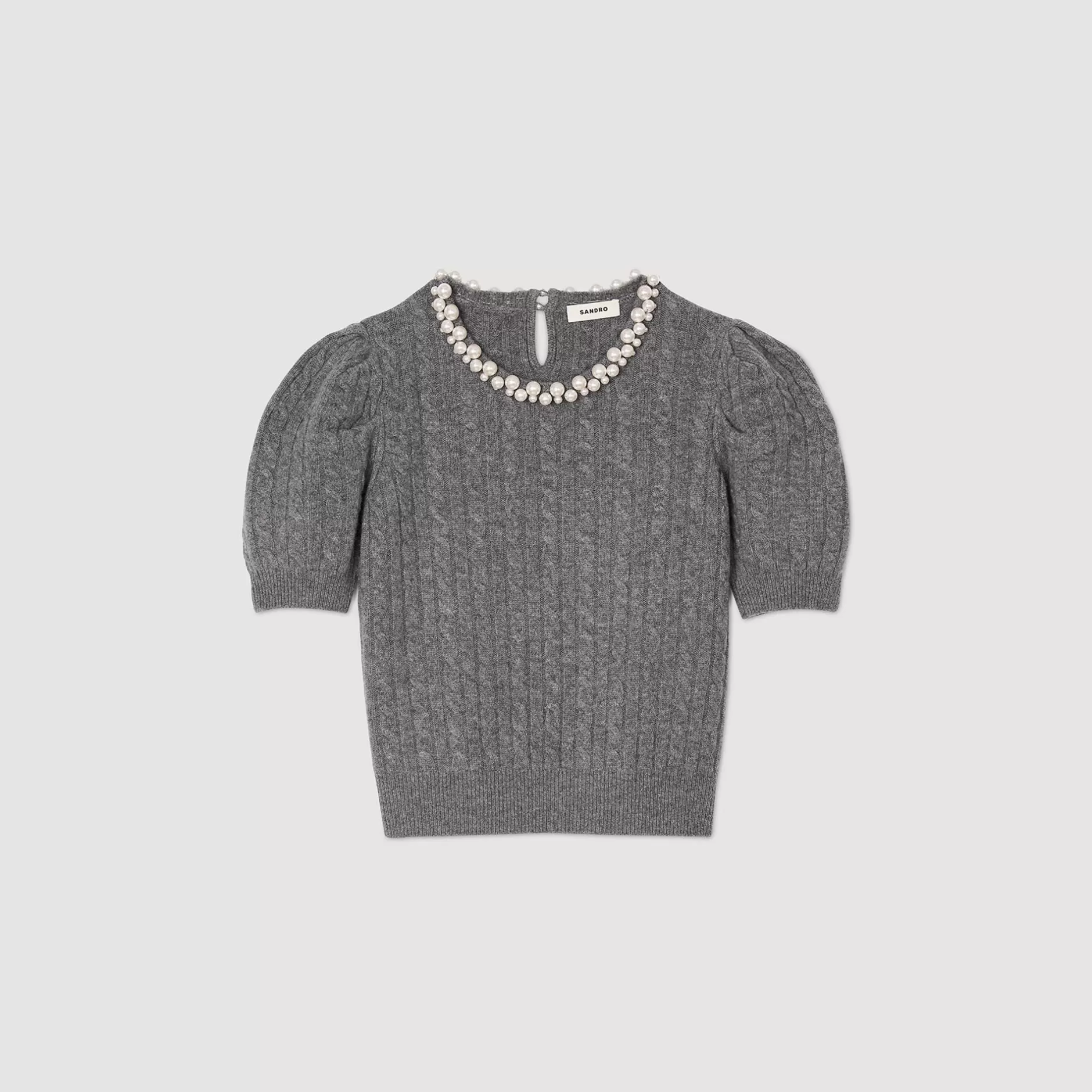 Pull en maille câblée composé de laine et cachemire, muni de manches courtes et d’un col rond orné de perles.