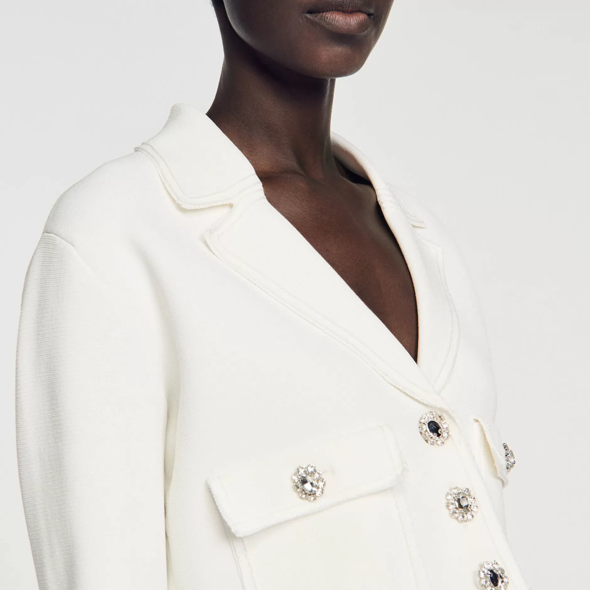 Cardicoat court esprit veste de tailleur muni d’un col cranté, de manches longues, de poches plaquées à rabats aux hanches, et orné d’une fermeture à boutons bijoux strassés.