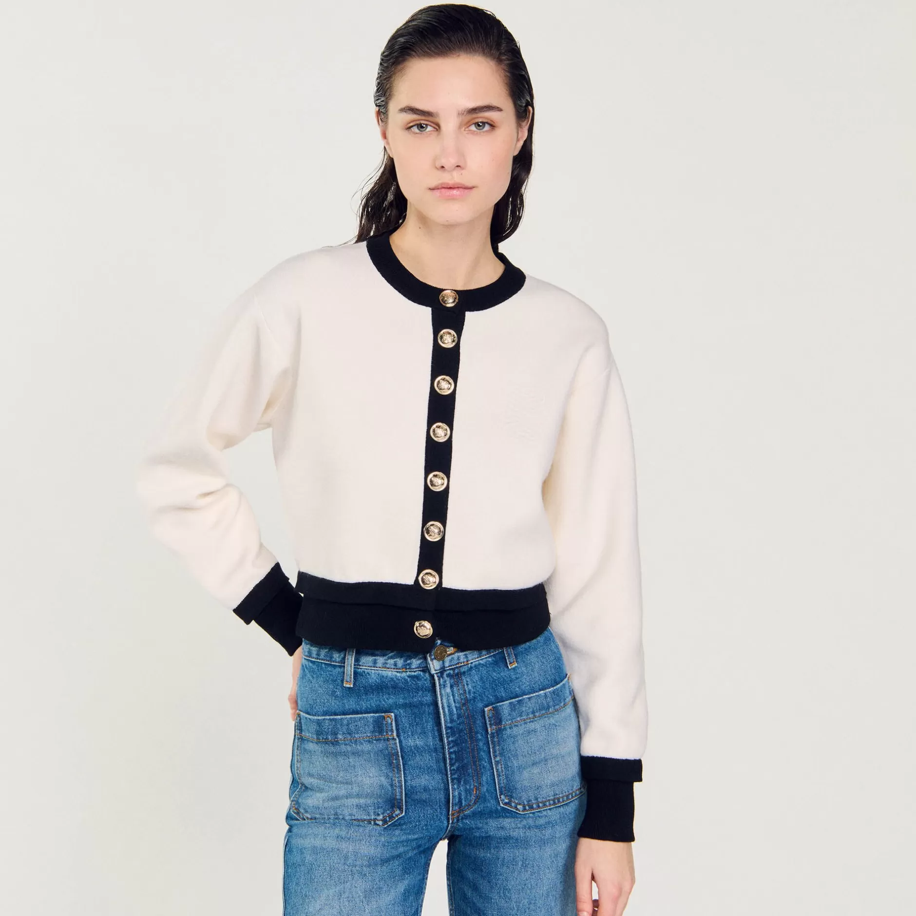 Cardigan court en maille à finitions contrastées, muni d’un col rond, de manches longues, d’une fermeture boutonnée à pressions dorées et orné d’une broderie ton sur ton à la poitrine.