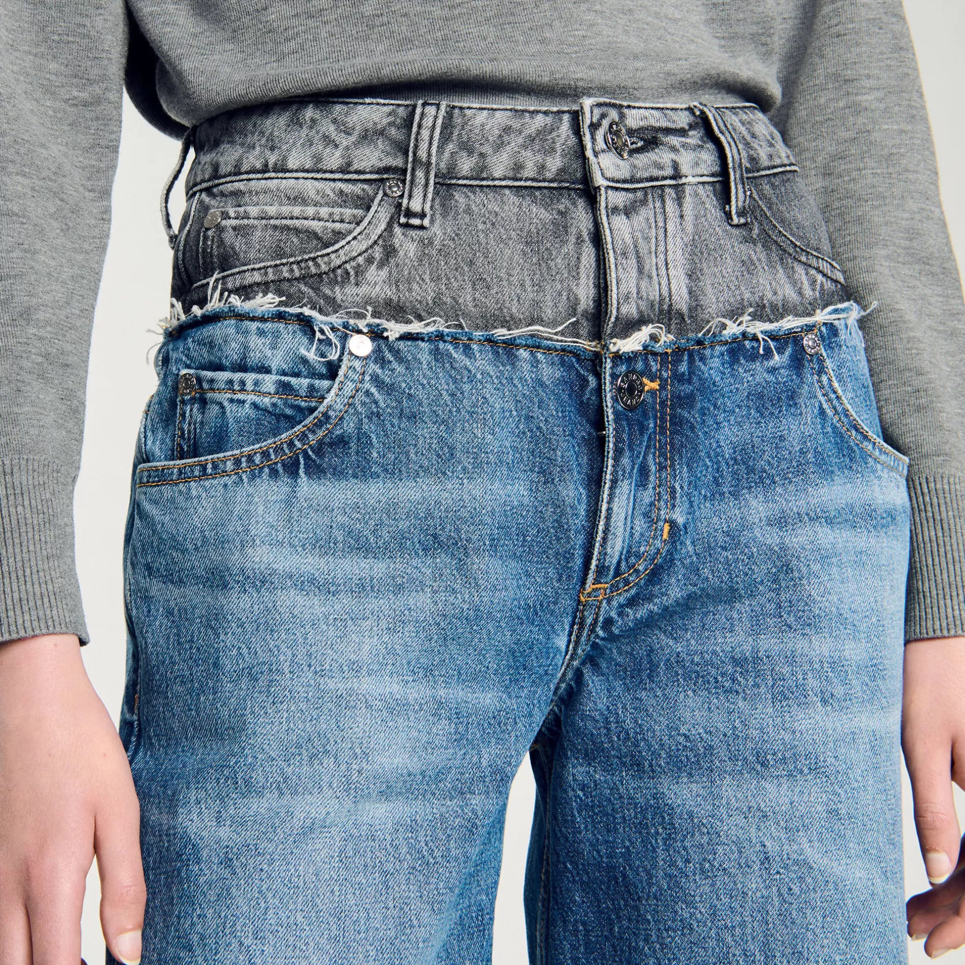 Jean large muni d’une double ceinture effilochée en trompe l’œil, de cinq poches et de passants à la ceinture.