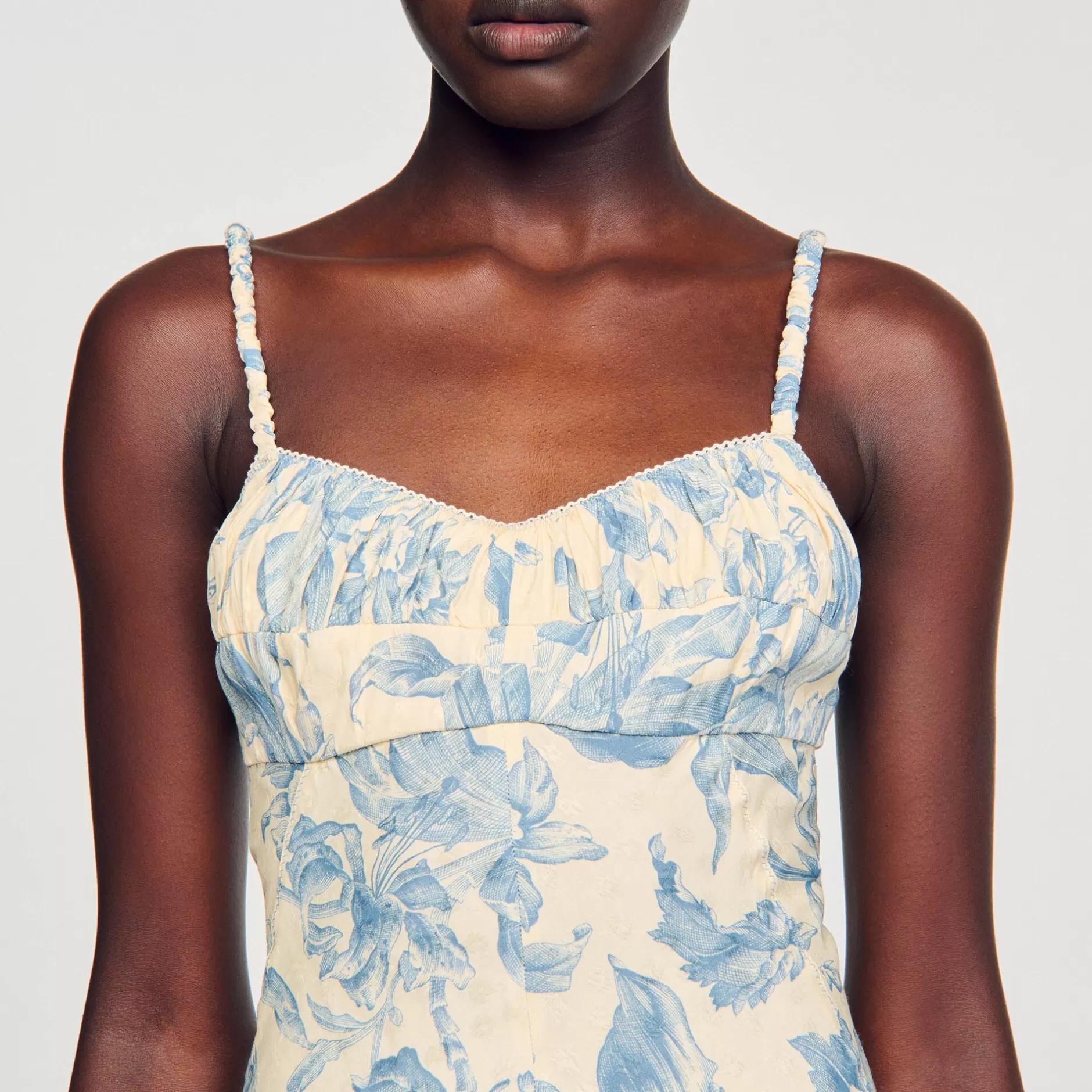 Robe longue à fines bretelles ornée d’un imprimé fleuri, munie d’un décolleté façon corset avec découpes te jeu de fronces, d’un dos décolleté à liens à nouer, et d’une jupe fluide et évasée sur le bas.