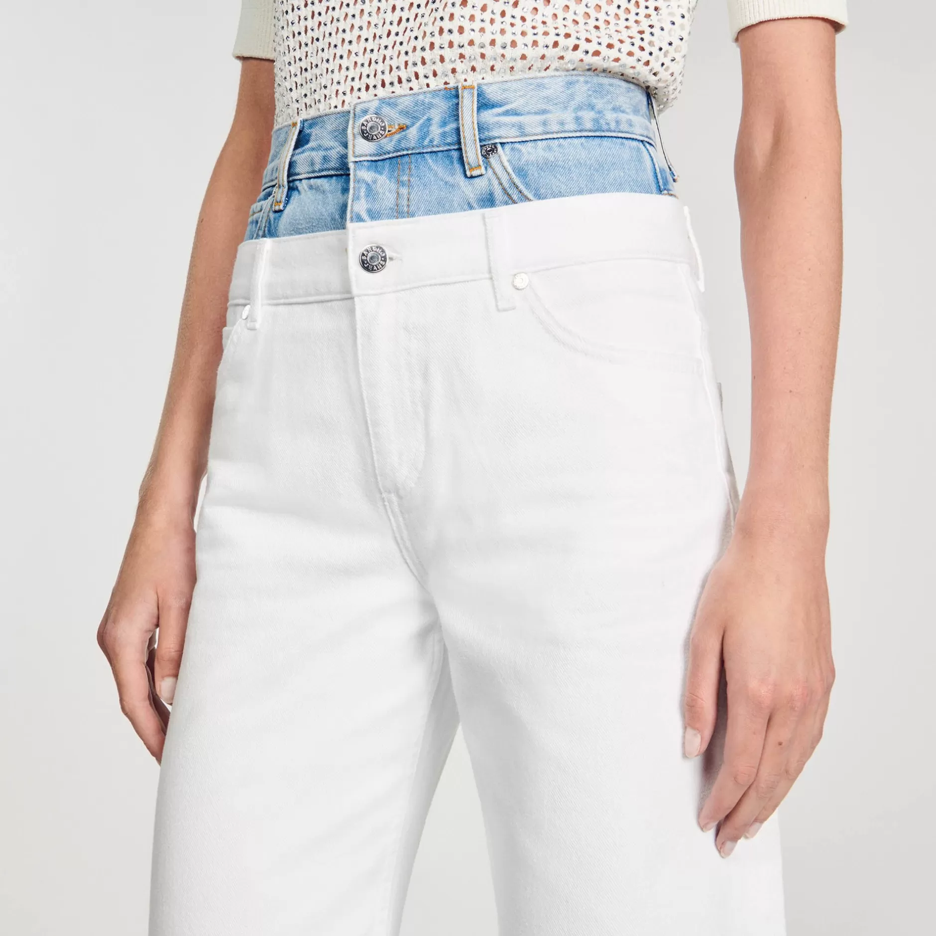 Jean droit taille haute en denim bicolore muni de 5 poches et d’une double ceinture.