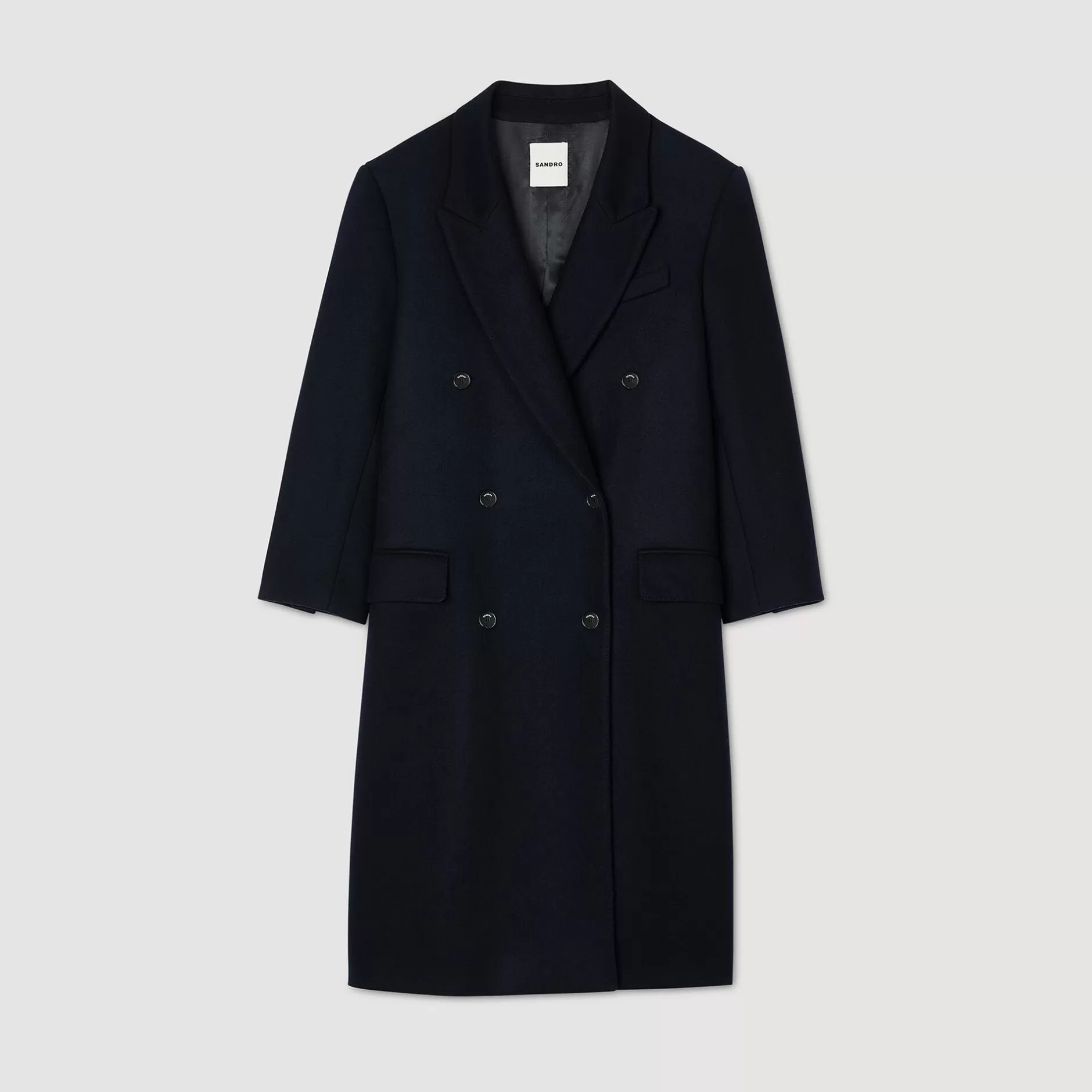 Manteau long, droit et oversize en laine mélangée, muni d’un col à revers, de manches longues à fentes aux poignets, d’une fermeture à double boutonnage et de poches à rabats.