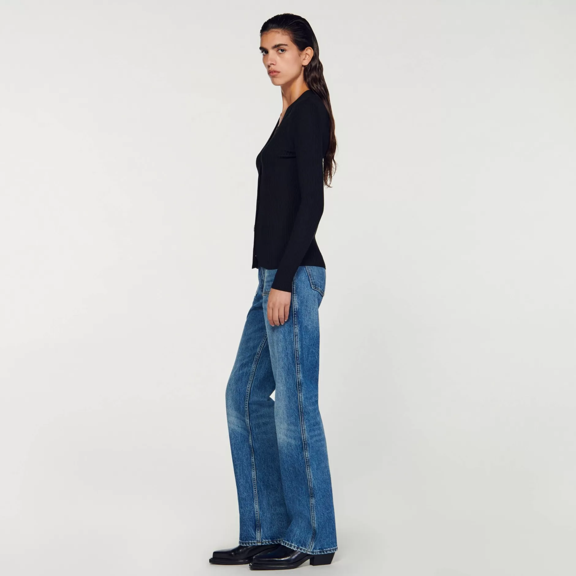 Cardigan en fine maille côtelé, muni d’un col en V, de manches longues et d’une fermeture boutonnée.