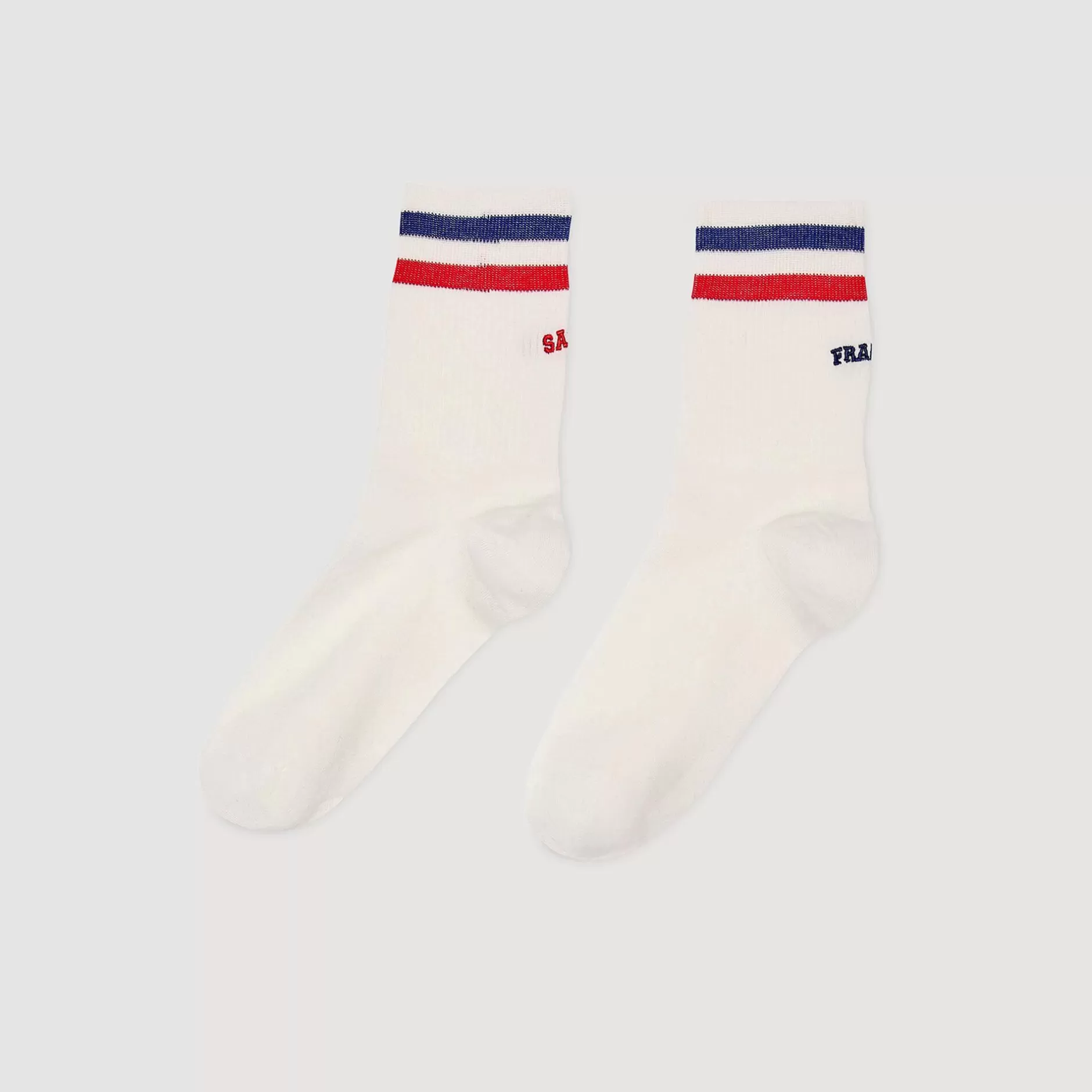 Chaussettes côtelées à bandes tricolores ornées de broderies contrastées sur les côtés. Chaussettes côtelées Sa…