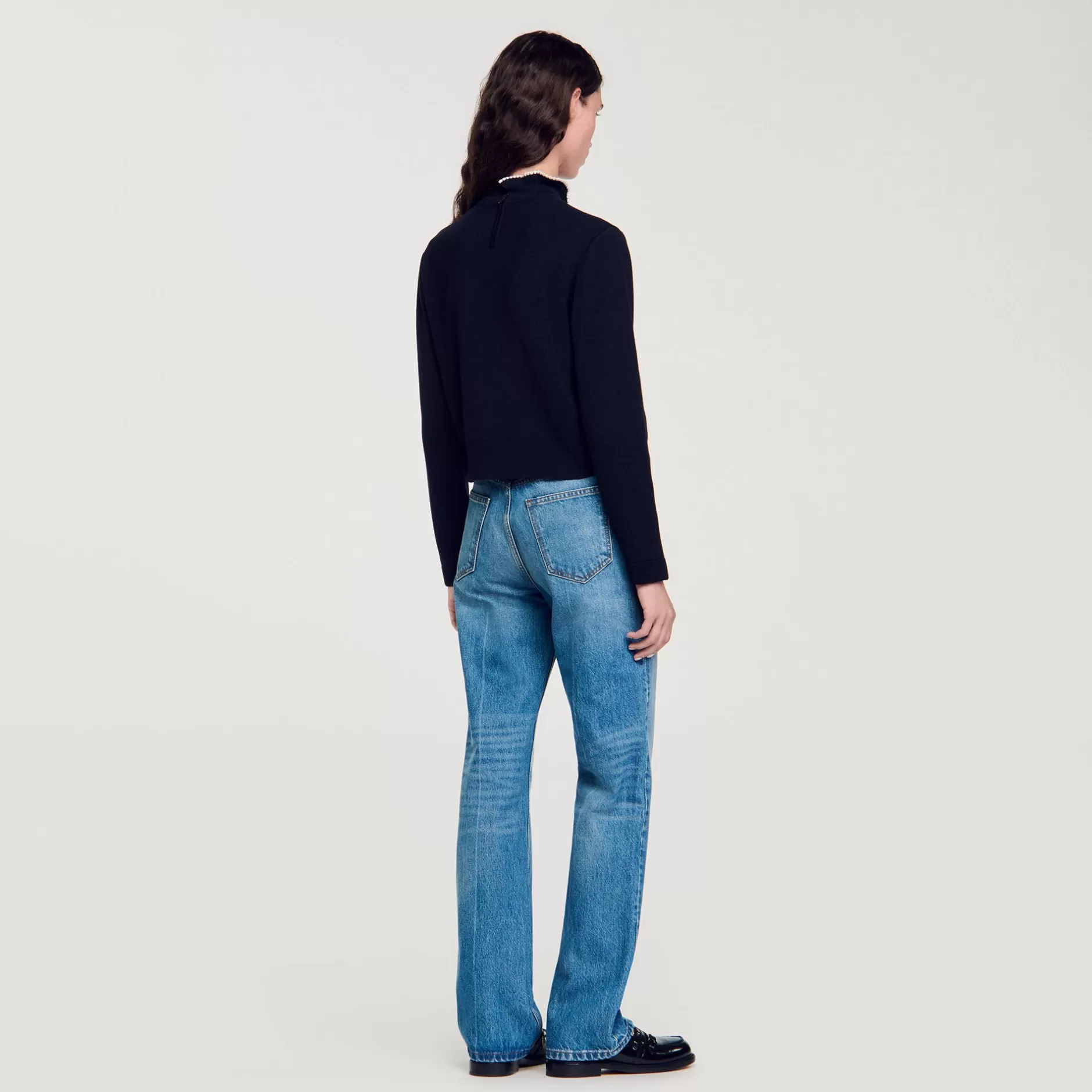Pull court en maille muni de manches longues et d’un col volanté. Pull court Sandro Femme Col volanté contrasté Manch…