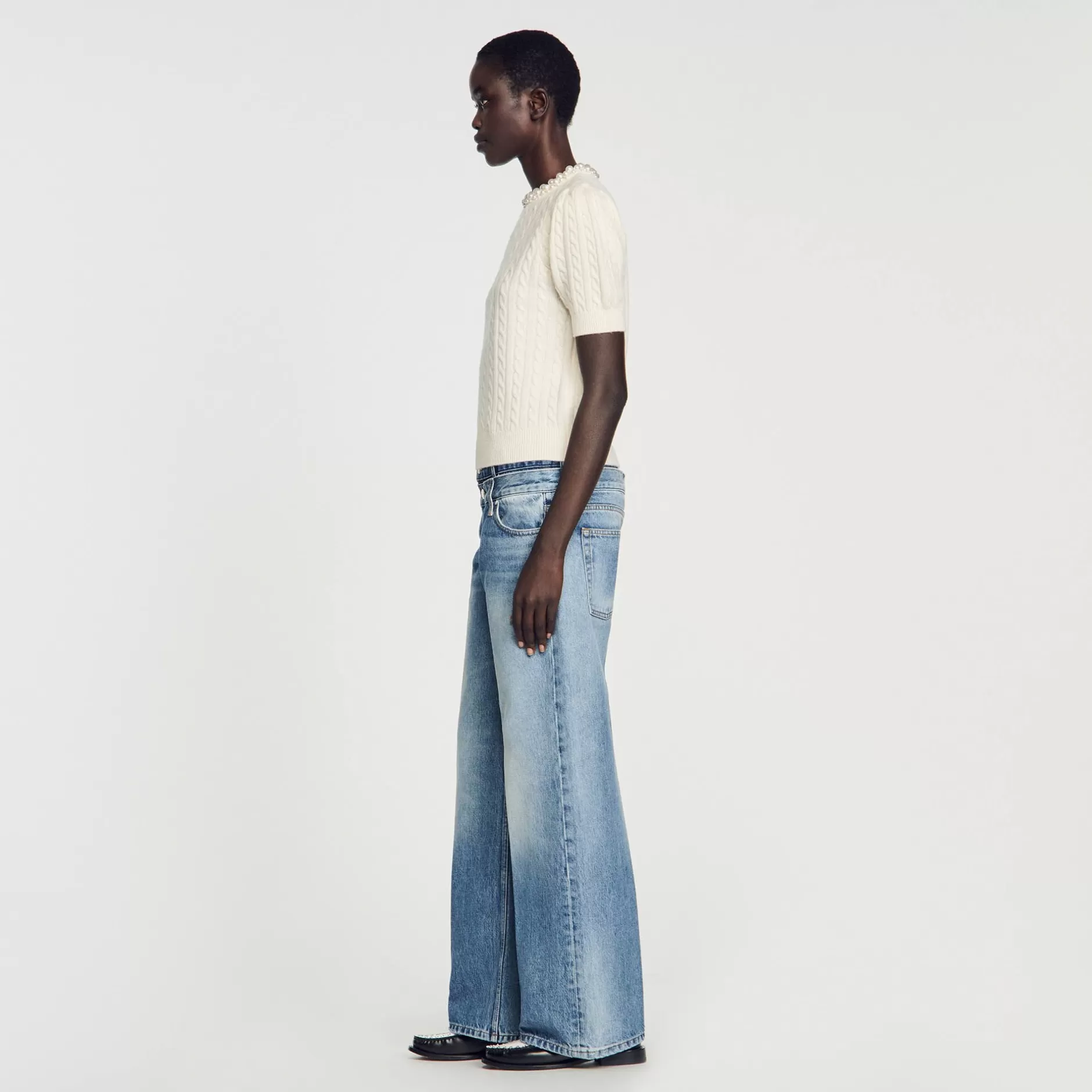 Pull en maille câblée composé de laine et cachemire, muni de manches courtes et d’un col rond orné de perles.