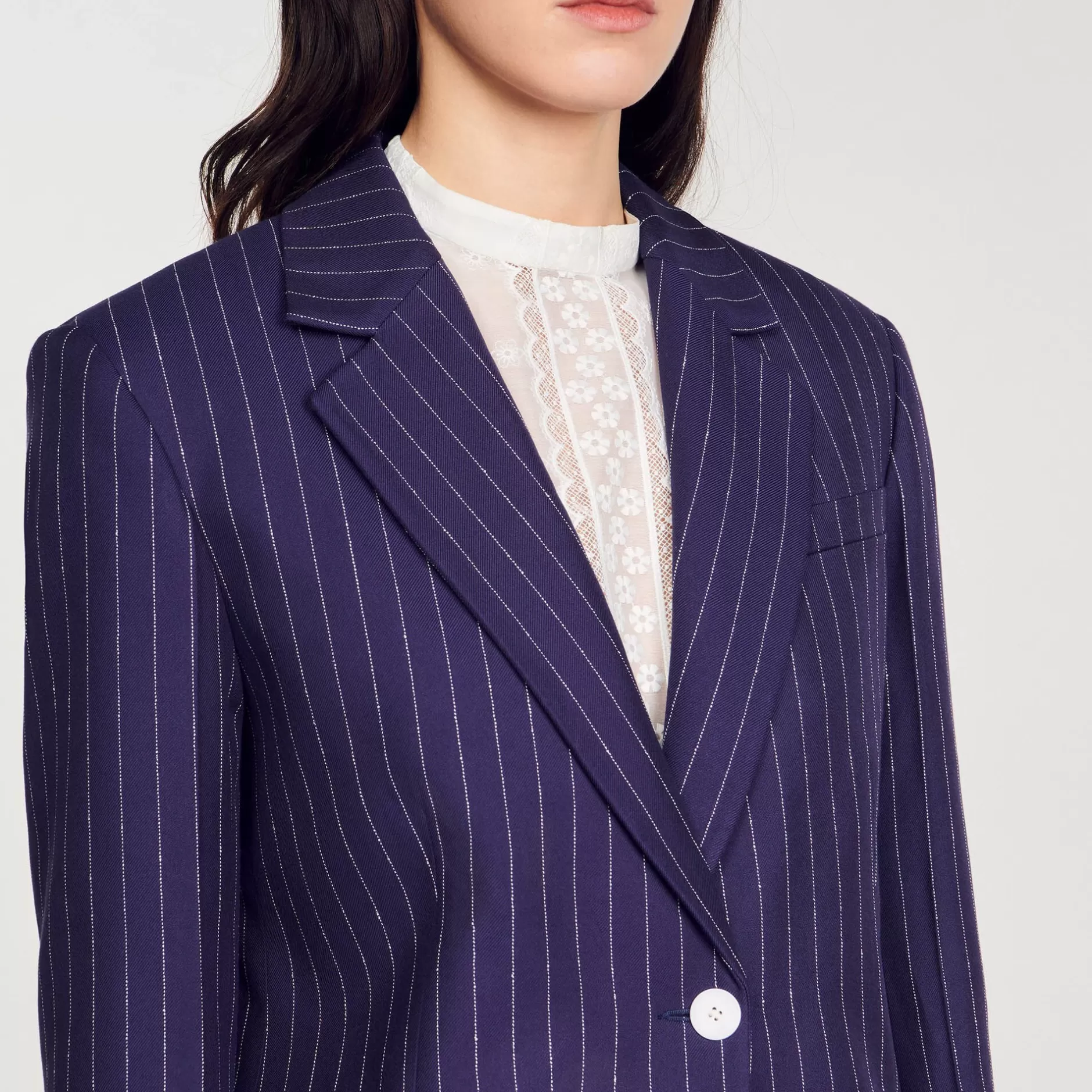 Veste de costume à fines rayures, munie d’un col cranté, de manches longues, de poches à rabats et d’une fermeture à bouton.